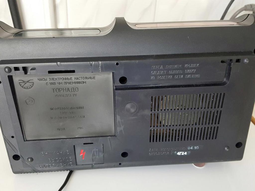 Стационарный радиоприёмник с таймером и часами *Торнадо* выпускался с 1986 года Киевским заводом *Буревестник*. **Торнадо** - устройство, состоящее из радиоприёмника с пятью фиксированными настройками в УКВ-ЧМ диапазоне, электронных часов, будильника и таймера автоматически включающего приёмник в заданное время. К аппарату можно подключить головные телефоны, в этом случае встроенный громкоговоритель автоматически отключится. При пропадании напряжения в электрической сети автоматически включается резервное питание для работы электронных часов в течении 10 часов. Диапазон принимаемых частот 65...74 МГц. Реальная чувствительность 15 мкВ. Диапазон воспроизводимых звуковых частот на линейном выходе 50...12500 Гц, на собственной АС 100...10000 Гц. Среднесуточный уход электронных часов ±1 секунда. Размеры устройства 280х170х90 мм. Вес 3,5 кг. Розничная цена 80 руб.