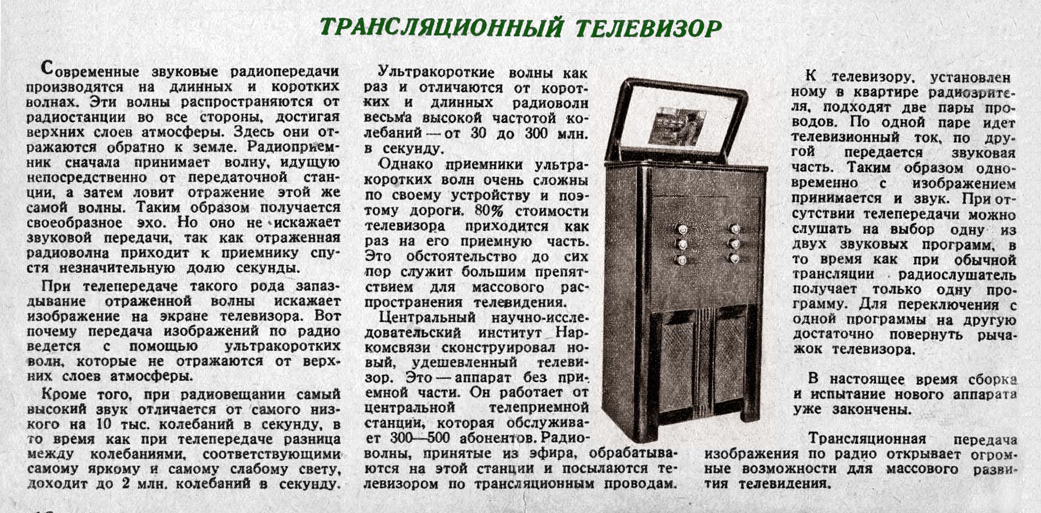 Трансляционный телевизор *ТТ* (*ТТ* - образное наименование) разработан в 1939 году. Первый телевизионный приёмник кабельного телевидения и радиовещания.