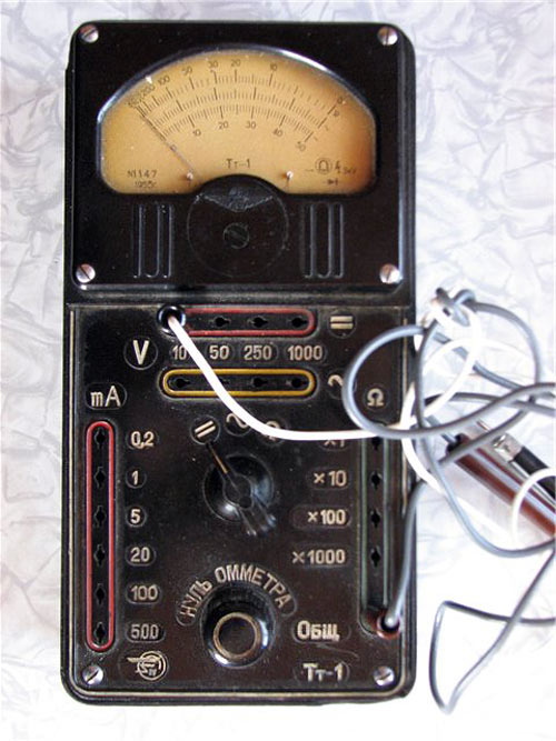 Комбинированный измерительный прибор типа *ТТ-1* с октября 1947 года выпускал один из заводов министерства авиационной промышленности. Комбинированный измерительный прибор **ТТ-1** - один из первых отечественных портативных комбинированных измерительных приборов. Он предназначен для измерения постоянного и переменного напряжения, силы постоянного тока, сопротивлений.