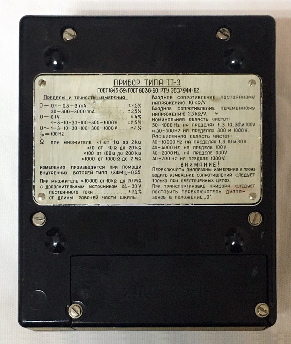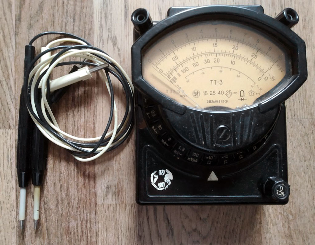 Комбинированный прибор *ТТ-3* возможно с 1960 года выпускал Тартуский завод контрольной аппаратуры, Эстония. Многопредельный комбинированный прибор **ТТ-3** предназначен для измерения постоянного тока и напряжения, переменного напряжения, а также сопротивления. Габариты прибора 65x110х135 мм. Его масса 700 гр. Питание для измерения сопротивлений осуществляется от батарей 1,3 ФМЦ-0,25.