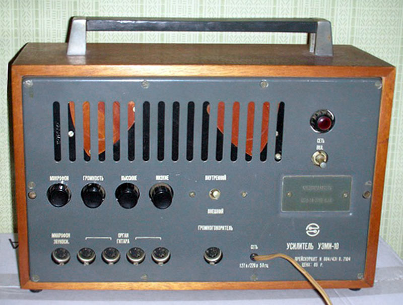 Усилитель низкой частоты *УЭМИ-10* выпускался с 1975 года. Усилитель эстрадный музыкальный индивидуальный *УЭМИ-10* предназначен для усиления и воспроизведения электрических сигналов с электромузыкальных инструментов и микрофона. Номинальная выходная мощность 8 Вт, максимальная 10 Вт. Диапазон усиливаемых частот по напряжению 20...20000 Гц, по звуковому давлению 80...10000 Гц. КНИ - 1%. Уровень фона - 60 дБ. Входное сопротивление внешней АС - 8 Ом. Потребляемая от сети мощность 60 Вт. Габариты усилителя - 335 х 120 х 255 мм. Масса 6 кг.