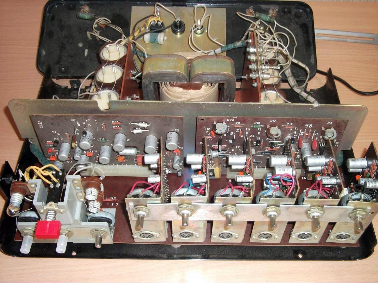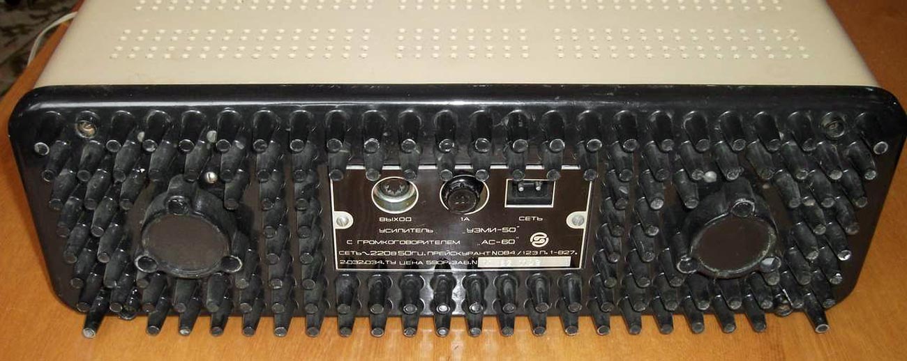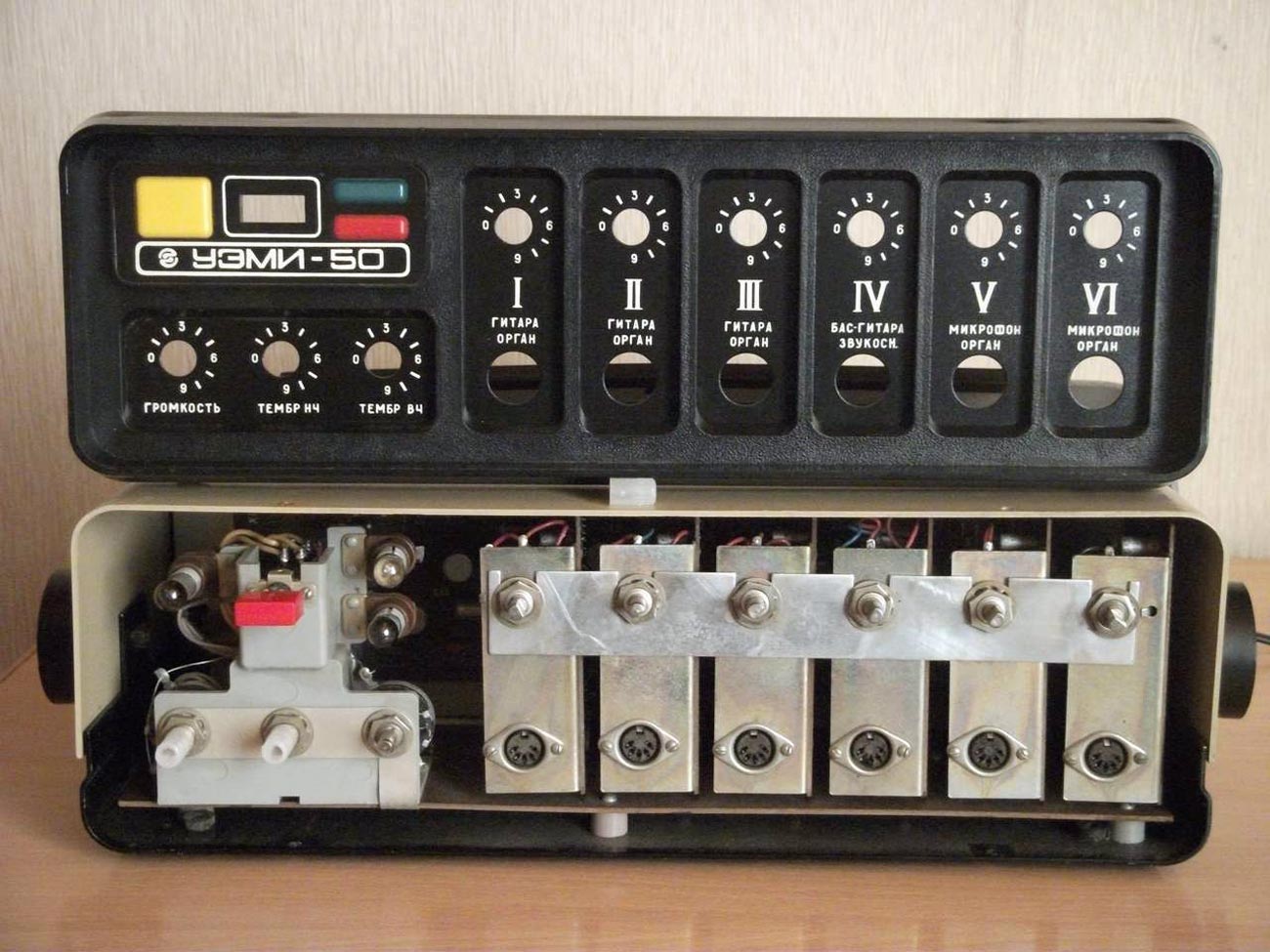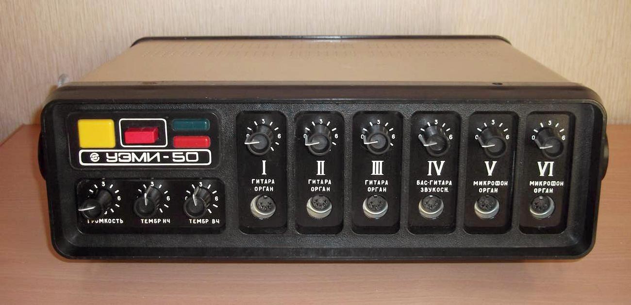 Эстрадный усилитель *УЭМИ-50* выпускался с 1980 года. Описание из рекламного проспекта. Усилитель *УЭМИ-50* с громкоговорителем *АС-50* - это модернизированный эстрадный усилитель улучшенной конструкции и акустики. Высоким качеством и силой музыкального звучания, надежностью и удобством в эксплуатации отличается переносный эстрадный усилитель УЭМИ-50. Усилитель позволяет одновременно подключать микрофоны, электрогитары и электроорганы, а также звукосниматель, магнитофон или радиоприемник. Модернизированный, имеется ввиду предыдущий ламповый усилитель, так же с наименованием *УЭМИ-50*. Транзисторный усилитель *УЭМИ-50* с 1985 года выпускался в другом оформлении передней панели. Технические характеристики: Подключение шести источников сигнала с активным микшированием любого из них. Номинальная выходная мощность 50, максимальная 60 Вт. Диапазон воспроизводимых частот, в том числе и АС - 50...18000 Гц. Уровень фона и собственных шумов не хуже -60 дБ. Коэффициент гармонических искажении не более 1%. Номинальное сопротивление усилителя и АС - 6 Ом. Габариты усилителя - 370х180х162 мм, АС - 300х500х700 мм. Масса усилителя - 9 кг, АС - 25 кг.