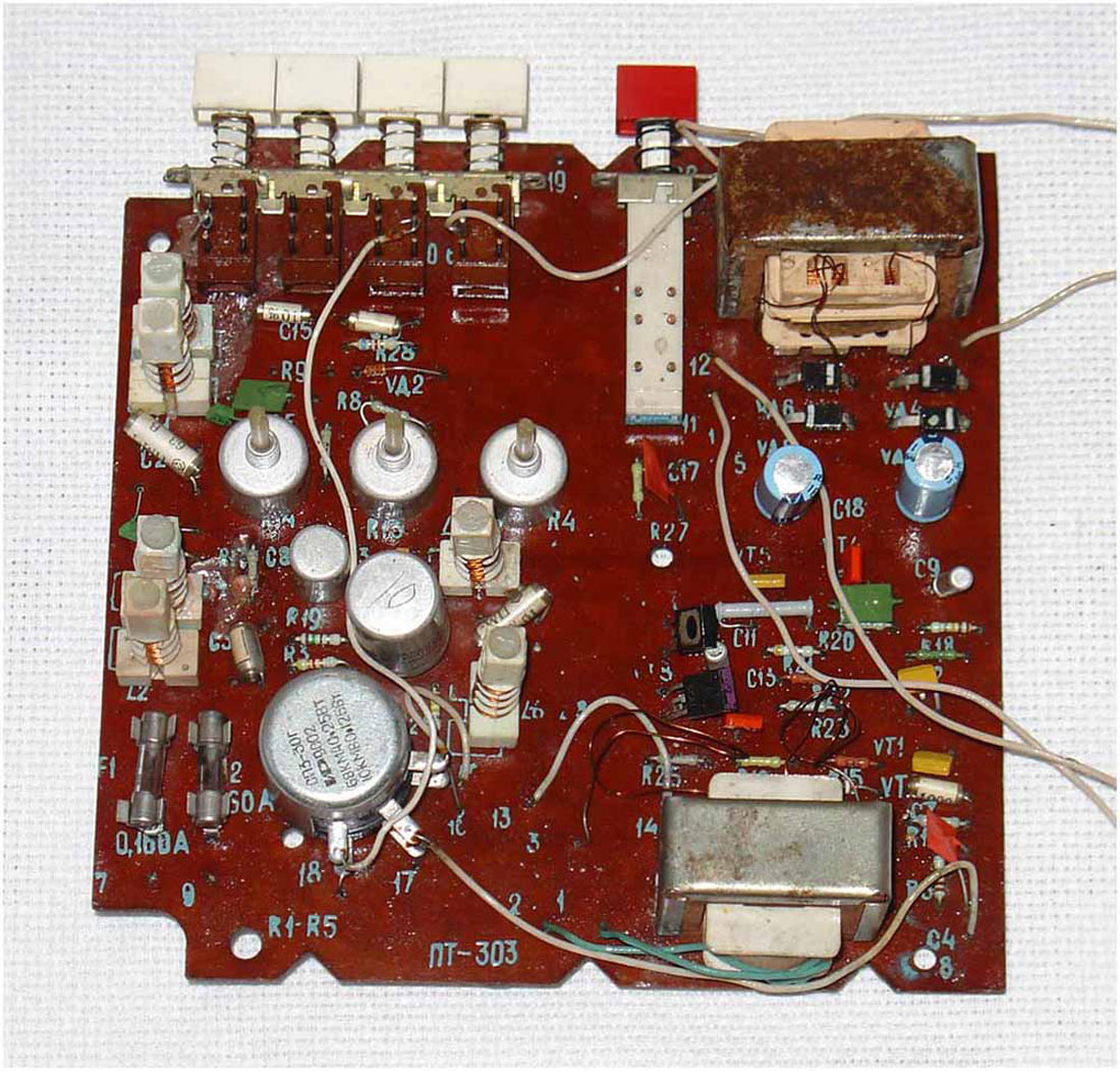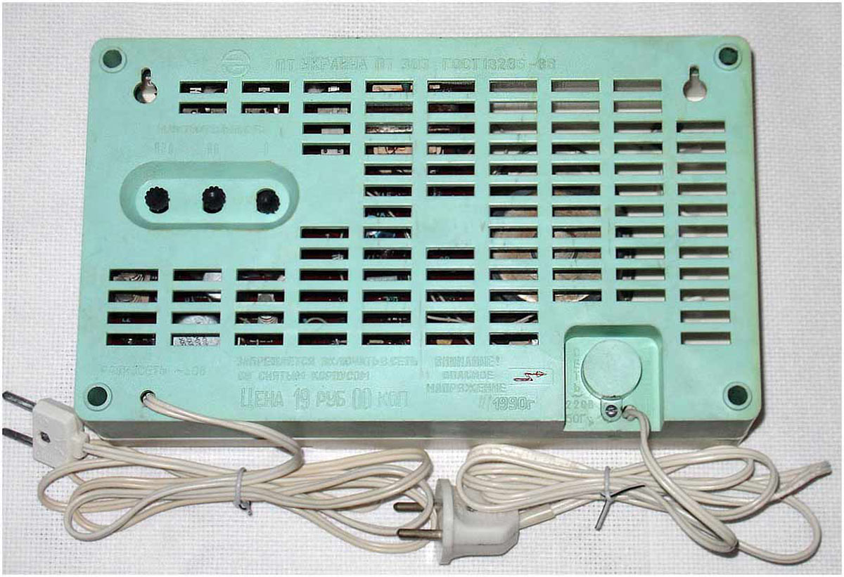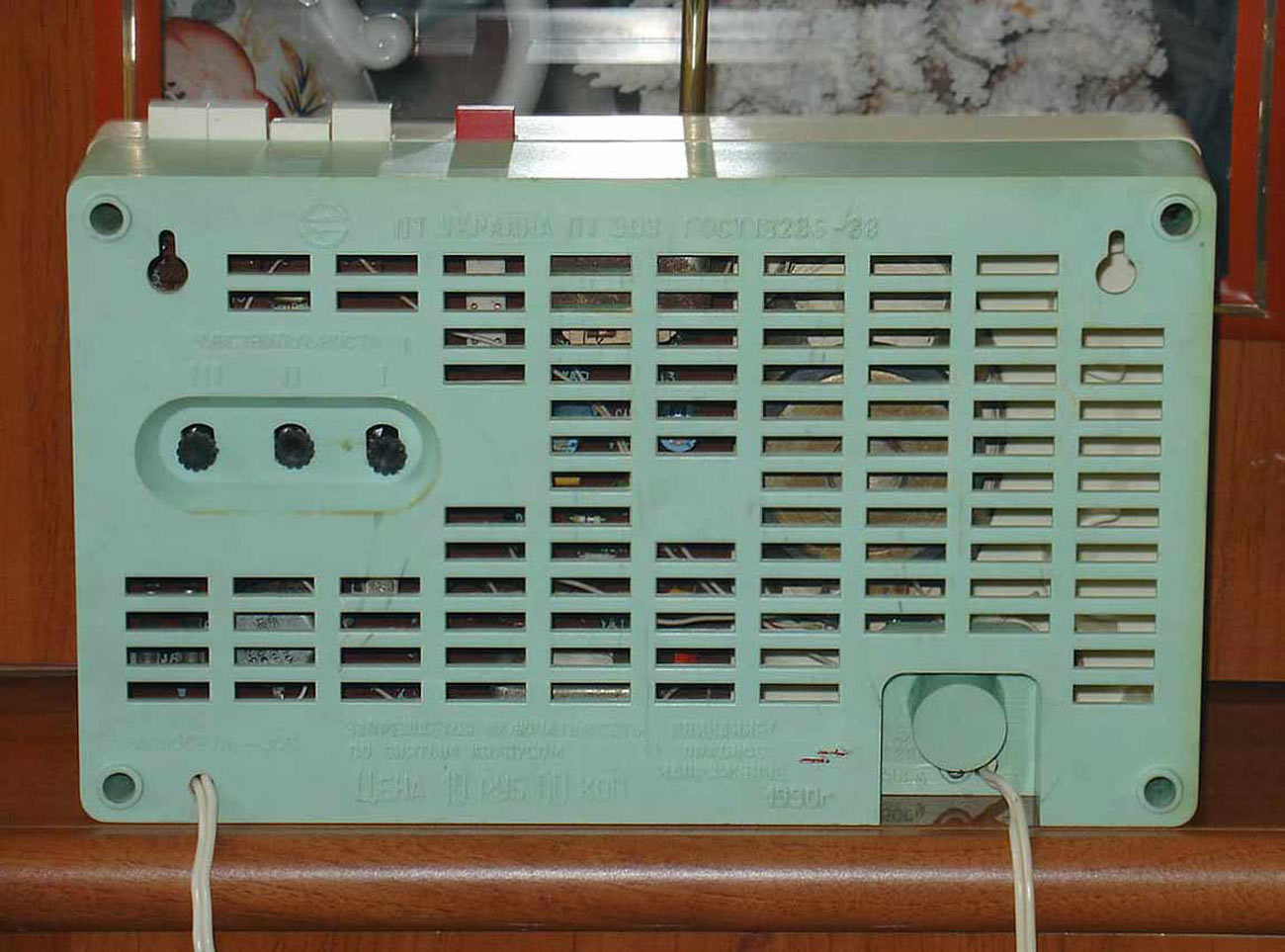 Приёмник трёхпрограммный *Украина-303* с I-кв 1983 года выпускал Макеевский завод электробытовых изделий *Импульс*. ПТ **Украина-303** предназначен для прослушивания любой из трёх программ, передаваемых по уплотнённой системе 3-х программного проводного вещания. ПТ работает с напряжением в трансляционной сети 30 В. Диапазон воспроизводимых частот звука НЧ канала 160...8000, ВЧ каналов 150...6300 Гц. Номинальная выходная мощность - 300 мВт, максимальная до 700 мВт. Имеется возможность дополнительного усиления первого НЧ канала. Потребляемая мощность 4 Вт. Габариты ПТ - 280х187х98 мм. Масса - 2,2 кг. С 1988 года ПТ выпускался под наименованием *Украина ПТ-303*.