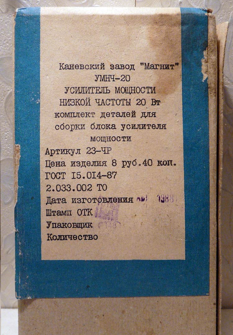 Радиоконструктор *УМНЧ-20* (Усилитель мощности низкой частоты 20 Вт) выпускал с 1988 года Каневский завод *Магнит*. РК позволяет собрать монофонический УМ для усиления сигналов с предварительного усилителя или с источников развивающих выходное напряжение ЗЧ 0,25...0,5 В. Диапазон воспроизводимых частот, при неравномерности АЧХ - 3 дБ - 20...20000 Гц. Номинальная выходная мощность, при сопротивлении нагрузки 4 Ом - 20 Вт. КНИ (частота 1 кГц) не более 5%. Чувствительность 250 мВ. Питание двухполярное +/- 25 В.