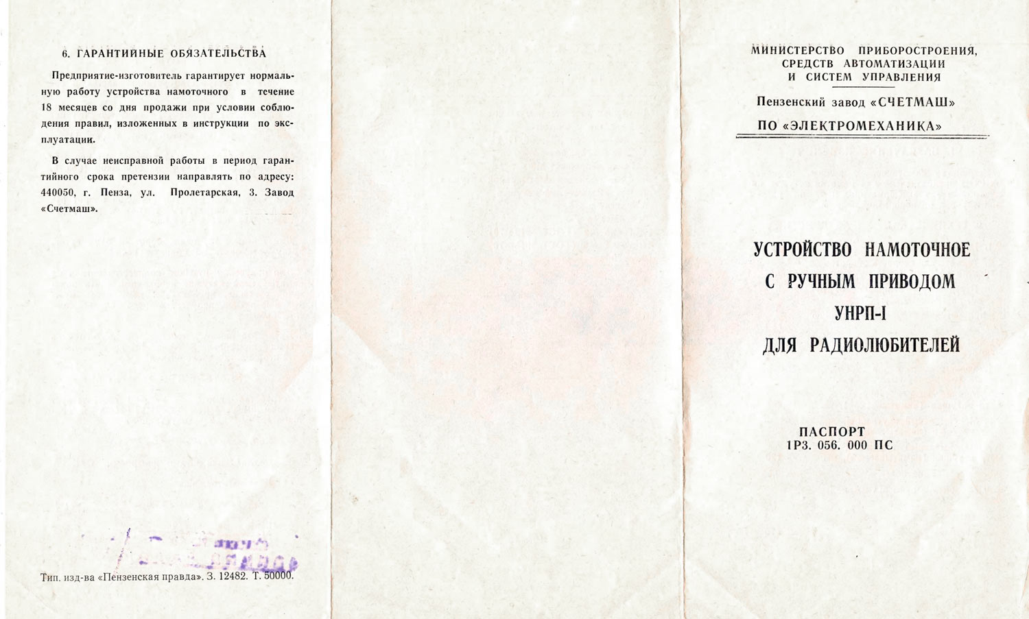 Устройство намоточное с ручным приводом *УНРП-1* для радиолюбителей выпускалось возможно с 1977 года Пензенским заводом *СЧЁТМАШ*.