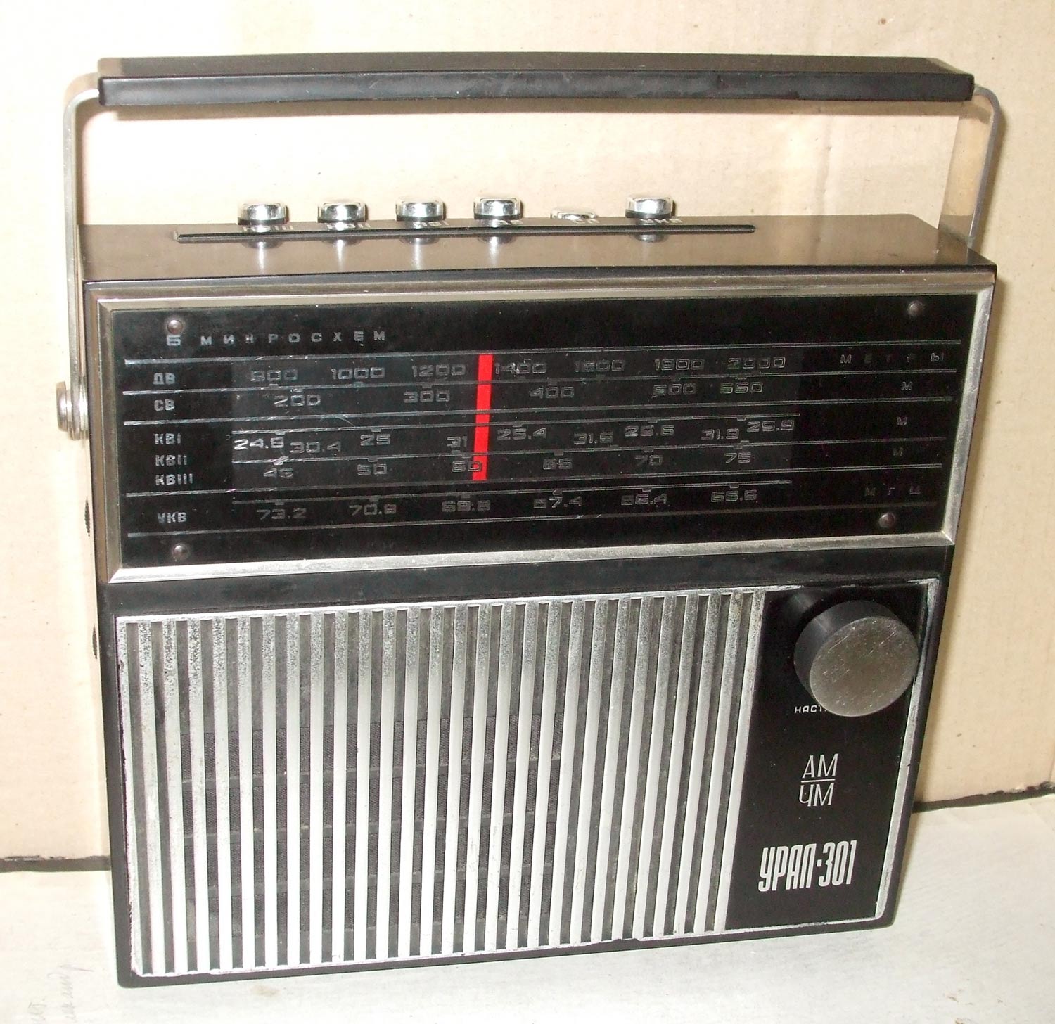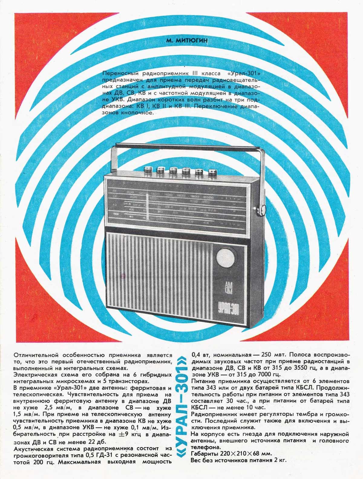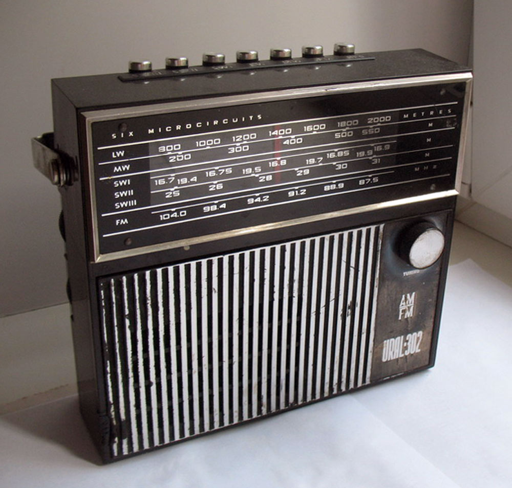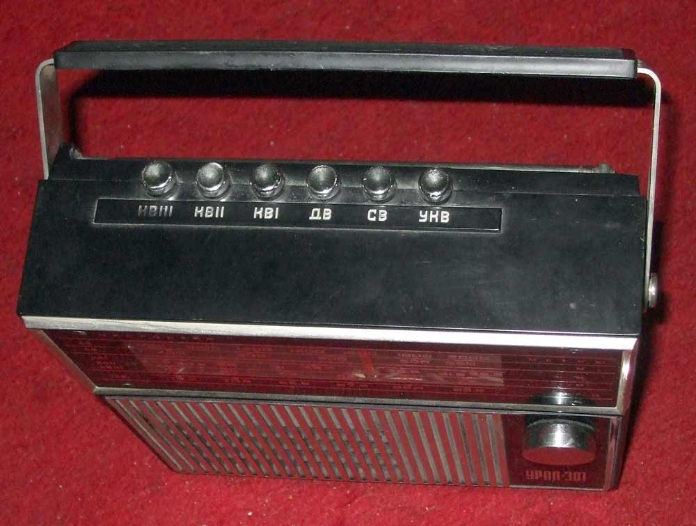 Портативные радиоприёмники *Урал-301* и *Урал-302* с 1971 и 1972 года выпускал Сарапульский радиозавод. Это первые переносные приёмники в СССР собранные на гибридных интегральных микросхемах. В приёмниках общая схема и конструкция, разница в отсутствии АПЧ в первой модели и в том, что вторая модель была предназначена как для внутреннего рынка, так и на экспорт. Внешний вид приёмников одинаков, кроме надписей и границ КВ и УКВ диапазонов в экспортном варианте. Любой из приёмников рассчитан на приём в диапазонах ДВ, СВ и КВ в поддиапазонах KB-1 12,1...11,6 МГц, КВ-2 9,9...9,4 МГц, КВ-3 7,3...3,95 МГц и в диапазоне УКВ 73,0...65,8 МГц. В ДВ, СВ приём ведётся на магнитную антенну, KB, УКВ на телескопическую. Чувствительность в ДВ - 2,5 мВ/м, СВ - 1,0 мВ/м, KB - 500 мкВ, УКВ - 100 мкВ. ПЧ тракта АМ - 465 кГц, ЧМ - 10,7 МГц. Избирательность по соседнему каналу 30 дБ. Полоса частот АМ тракта - 315...3550 Гц, ЧМ - 315...7000 Гц. В приёмниках применены 6 гибридных интегральных микросхем *Трап-2*. Громкоговоритель 0,5ГД-31. Номинальная выходная мощность 0,4 Вт. Питание 6 элементов А-343 или две батареи 336. Размеры приёмника 211 х 233 х 76 мм. Масса с батареями 2 кг.