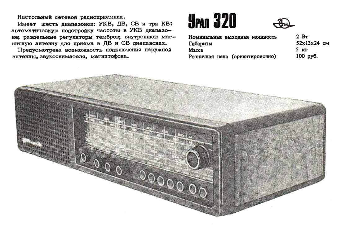 Стационарный транзисторный радиоприёмник *Урал-320* с 1983 года выпускал Сарапульский завод имени Орджоникидзе. Радиоприёмник рассчитан на приём в диапазонах ДВ, СВ, КВ (3 поддиапазона) и УКВ. В нём имеется АПЧ в диапазоне УКВ, раздельная регулировка тембра по НЧ и ВЧ, внутренняя магнитная антенна для приёма в диапазонах ДВ и СВ. Реальная чувствительность в диапазонах: ДВ и KB - 200 мкВ, СВ - 150 мкВ и УКВ - 5 мкВ. Селективность в диапазонах ДВ, СВ 30 дБ. Номинальная выходная мощность 2 Вт. Диапазон воспроизводимых звуковых частот в тракте АМ - 125...3550 Гц, УКВ-ЧМ - 125...10000 Гц. Потребляемая мощность 15 Вт. Габариты приёмника - 523х127х238 мм. Масса - 5,5 кг. Розничная цена 100 рублей. Приёмник выпускался по 1986 год включительно. Выпущено около 100 тысяч экземпляров. Завод так же подготовил к выпуску с 1983 года радиоприёмник *Урал-322*, который отличался от описанного наличием электронных часов и таймера, выносом громкоговорителя на верхнюю панель и соответственно оформлением. В производство этот приёмник не пошёл.