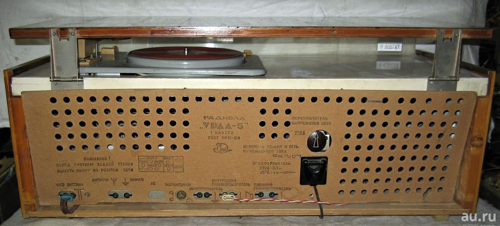 Сетевая ламповая радиола **Урал-5** с 1967 года выпускалась Сарапульским радиозаводом имени Орджоникидзе. Радиола рассчитана на приём в диапазонах: ДВ, СВ, KB-2 - 75,9...40,5 м, KB-1 - 32,0...24,8 м и УКВ-ЧМ. Чувствительность с внешней антенной в ДВ, СВ диапазонах 20 мкВ, КВ 50 мкВ, на УКВ-ЧМ 5 мкВ. Чувствительность с магнитной антенной в диапазонах ДВ, СВ 0,6...1,5 мВ/м, в положении *местный приём* 0,4...0,8 мВ/м. ПЧ в AM тракте 465 кГц, в ЧМ тракте 6,5 МГц. Ширина полосы пропускания AM тракта при ослаблении сигнала на 6...8 дБ в положении узкая полоса 5 кГц, широкая полоса 11 кГц, местный приём 15 кГц. Ширина полосы пропускания в ЧМ 130...180 кГц. Избирательность по соседнему каналу при расстройке на 10 кГц в - ДВ, СВ 60 дБ. Крутизна скатов резонансной характеристики в УКВ-ЧМ диапазоне равна 0,3 дБ/кГц. Избирательность по зеркальному каналу в диапазонах ДВ 65 дБ, СВ 46 дБ, KB-1, КВ-2 20 дБ, УКВ-ЧМ 28 дБ. АРУ обеспечивает изменение сигнала на выходе радиолы на 12 дБ при изменении сигнала на входе на 40 дБ. Номинальная выходная мощность УНЧ - 2 Вт, максимальная 3,5 Вт. Чувствительность с гнёзд звукоснимателя 200 мВ. Диапазон воспроизводимых частот в AM тракте в положении *узкая полоса* 80...4000 Гц, *широкая полоса* 80...6000 Гц, *местный приём* 80...8000 Гц. ЧМ тракта 80...12000 Гц, грамзаписи 80...10000 Гц. Регулировка тембра раздельная для НЧ и ВЧ. Уровень фона со входа усилителя -56 дБ. В радиоле установлено ЭПУ типа II-ЭПУ-40-127 имеющее четыре скорости: 78, 45, 33, 16 об/мин, полуавтоматическое включение и автоматическое выключение, микролифт. Так же устанавливалось ЭПУ типа III-ЭПУ-20-3-127 без скорости в 16 об/мин. Потребляемая от сети мощность при радиоприёме 55 Вт при прослушивании грамзаписи 65 Вт.
