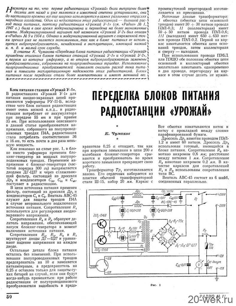 Радиостанции *Урожай У-1* и *Урожай У-2* выпускали с 1947 и 1954 года Омский радиозавод им. Козицкого и Егоршинский радиозавод. Радиостанция **Урожай У-1** предназначена для радиосвязи в сельском хозяйстве. Она работает в диапазоне 2000...3000 КГц и выпускалась в нескольких сериях по частотам. Каждая радиостанция имеет две фиксированные частоты стабилизированные кварцами, поэтому при работе настройка не требовалась. Радиостанция допускает симплексную и дуплексную связь. Симплексная работа производится на одной частоте. Дуплексная связь ведется как по обычному телефону. В этом случае передатчики радиостанций работают на разных частотах, отличающихся на 456 кгц. Для работы нужны 2 антенны: для приёма и передачи. Возможно присоединение радиостанции к телефонной сети. Радиостанция обеспечивает уверенную связь на расстоянии до 30 км. Мощность излучения составляет 0,75 Вт. Питание от аккумуляторной батареи 12 В. Анодное напряжение получается от вибропреобразователя. С 1954 года выпускалась модернизированная радиостанция **Урожай У-2** на пальчиковых радиолампах которая могла питаться так же и от сухих батарей. Доработка блока питания (Радио №11/1960 ст.50):