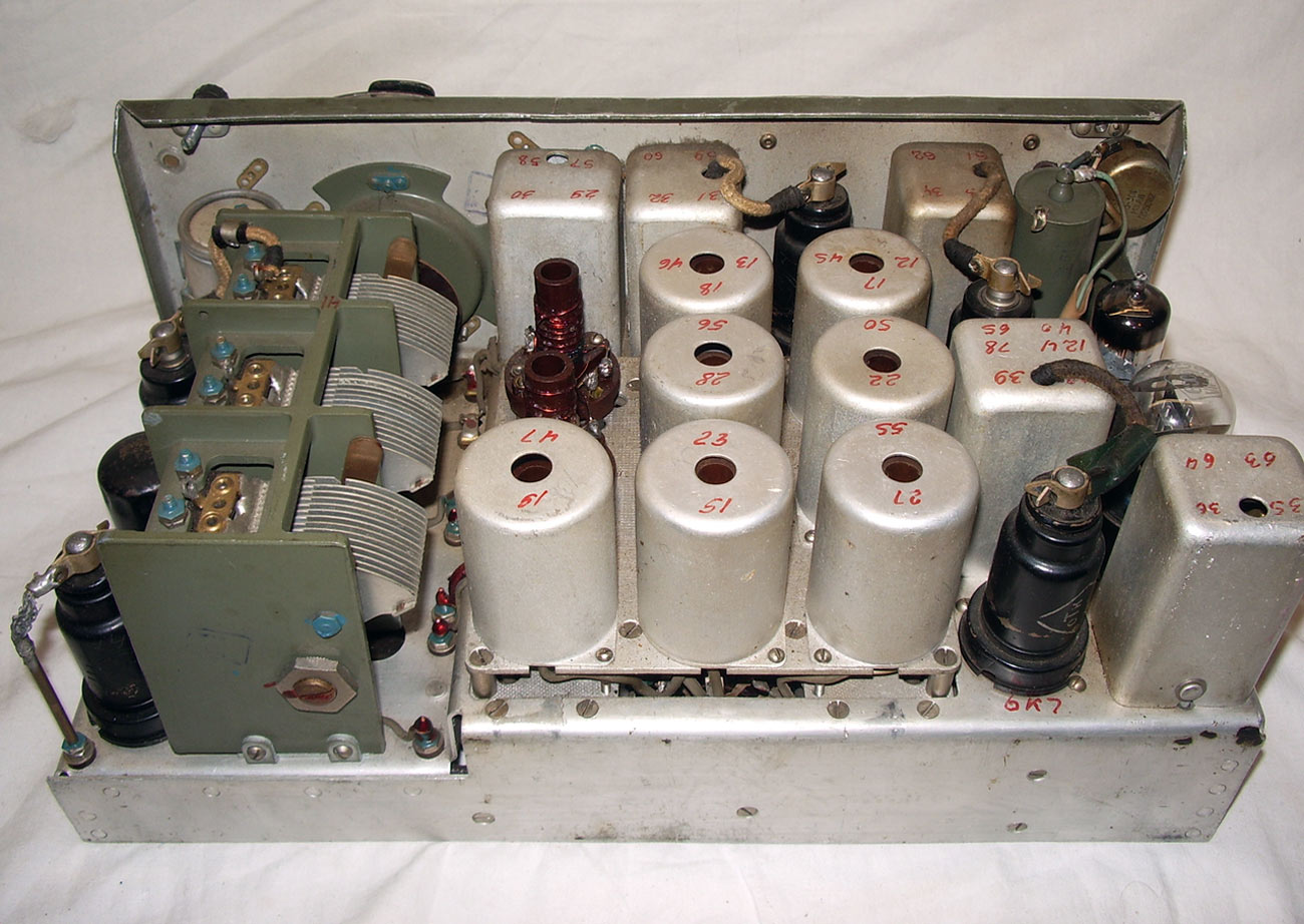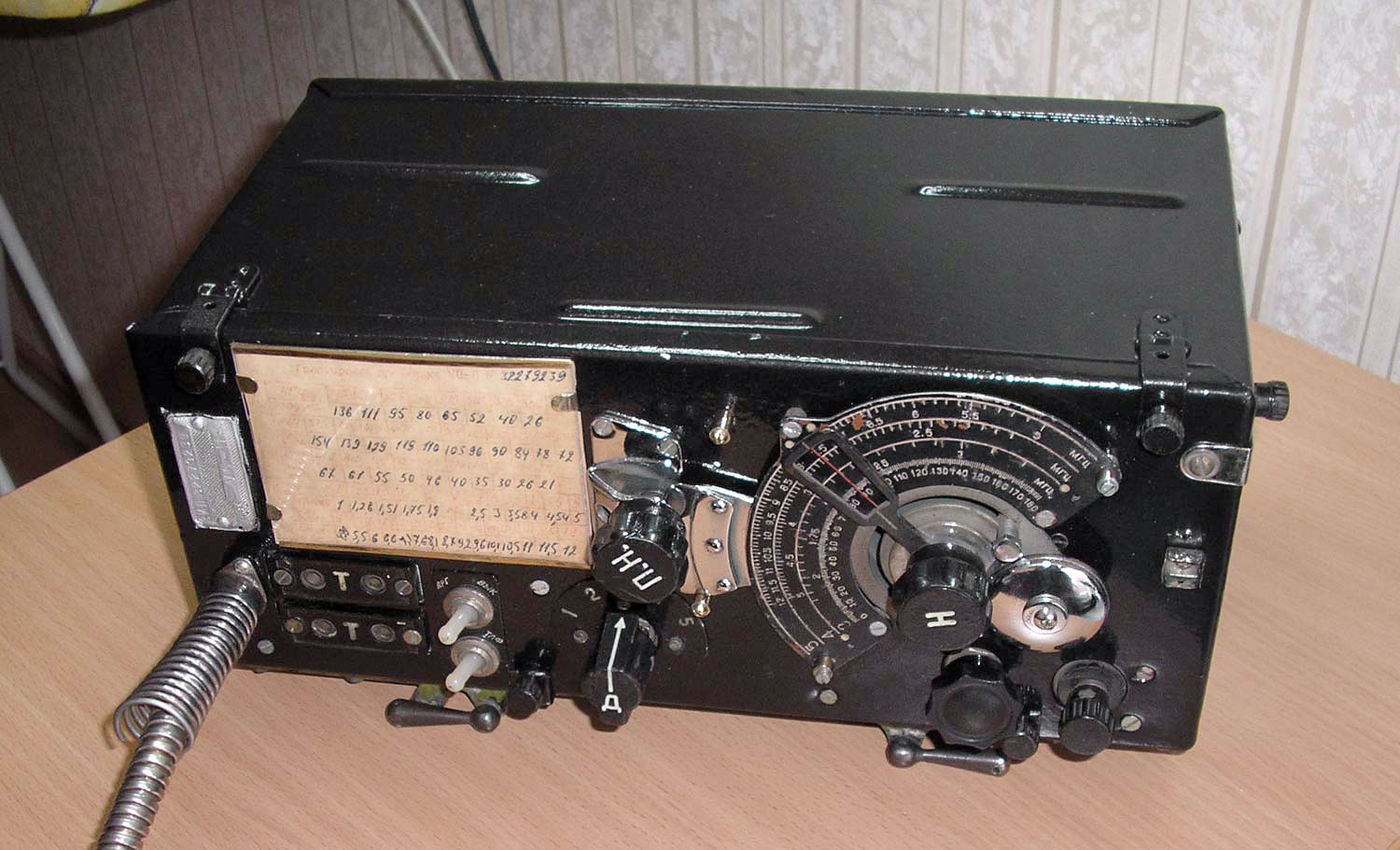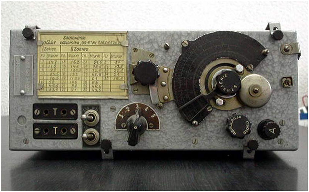 Универсальный КВ радиоприёмник *УС-П* выпускался возможно с 1948 года. Приёмник предназначен для приёма радиостанций работающих АМ, тональной модуляцией и телеграфом (CW). Он стал модернизацией приёмников **УС** и **УС-1**. Приёмник был создан для военной авиации, но применялся как связной и даже как трансляционный. Он представляет собой супергетеродин с одним преобразованием частоты, имеет диапазон от 173 кГц до 12 МГц разбитый на пять поддиапазонов. Градуировка на поддиапазонах **I** 173...350 кГц и **II** 350...875 кГц отсутствует, её заменяет точная шкала разбитая на 180 градусов. Диапазоны 3 - 4 - 5 имеют перекрытие 900..2150 кГц, 2150...5000 кГц и 5000...12000 кГц. Аппарат имеет каскад УВЧ на лампе 6К7, преобразователь с гетеродином на лампах 6А7 и 6К7, два каскада УПЧ на 2-х лампах 6К7. ПЧ = 112 кГц. Каскады охвачены системой АРУ с задержкой. На 5-м поддиапазоне УВЧ отключает схему АРУ и работает с максимальным усилением. Детектор и АРУ собраны на лампе 6Х6С. УНЧ собран на лампе 6К7, которая нагружена на автотрансформатор с отвода которого через ёмкость подаётся сигнал на телефоны. Чувствительность приёмника 10 мкВ в АМ режиме и 4 мкВ в CW. Избирательность по соседнему каналу при приёме в CW превышает 90 дБ, при приёме АМ около 60 дБ. Питание осуществляется от умформера который от напряжения 25,5 В постоянного тока обеспечивает напряжение 220 В по цепям анода и 6,3 В по накалу, при токе 0,6 А. Размеры приёмника 113х331х204 мм. Вес без умформера 5,6 кг. Надписи на ручках управления выполнены радиоактивной краской, фон которой превышает естественный в 15...30 раз и постоянно светящейся в темноте красивым зеленоватым светом, впрочем впоследствии надписи выполнялись обычной белой краской.