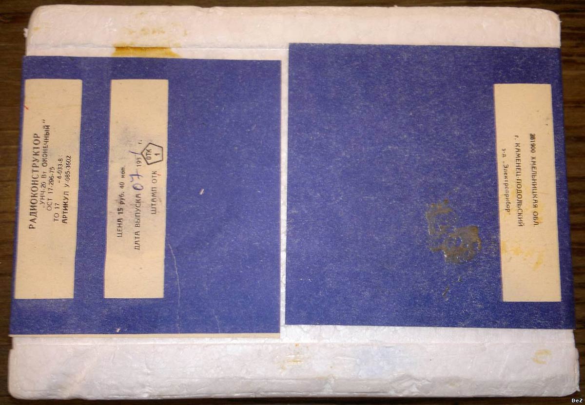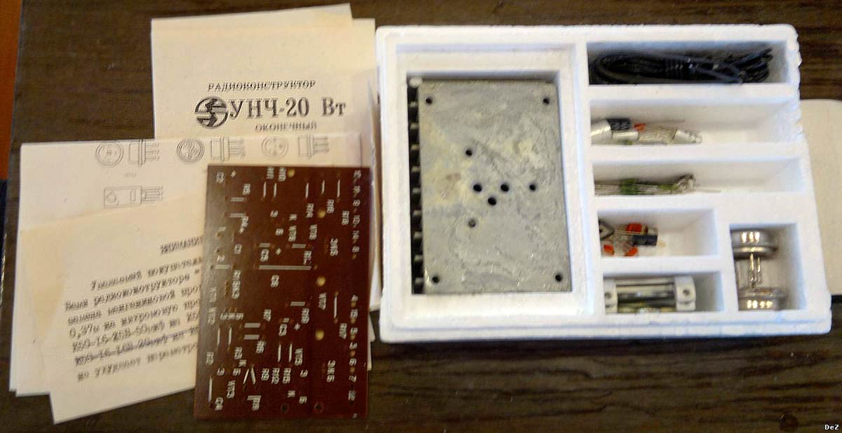 Радиоконструктор *УНЧ-20 Вт* (оконечный усилитель низкой частоты) выпускался с 1982 года. РК предназначен для сборки монофонического УМ предназначенного для усиления сигналов с магнитофона, проигрывателя и предварительного усилителя. Номинальная выходная мощность, на нагрузке 4 Ом 20 Вт. Диапазон частот, при неравномерности АЧХ - 0,5 дБ - 20...20000 Гц. Номинальное входное напряжение 1 В. Коэффициент гармоник 0,7%. Относительный уровень помех -70 дБ.