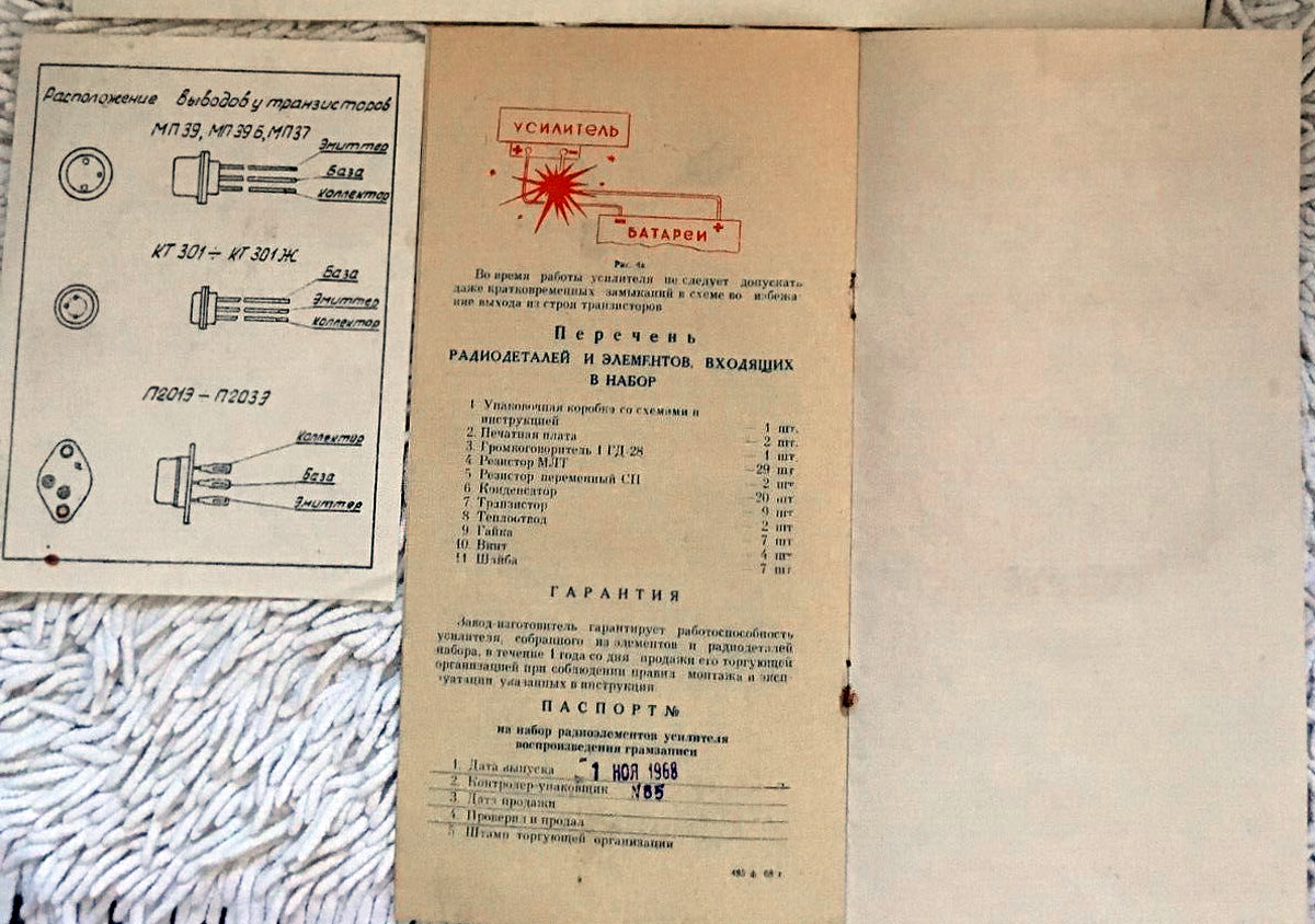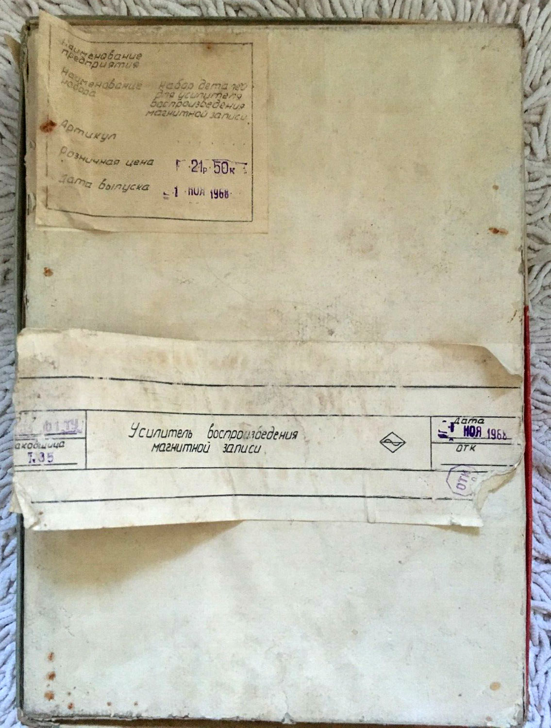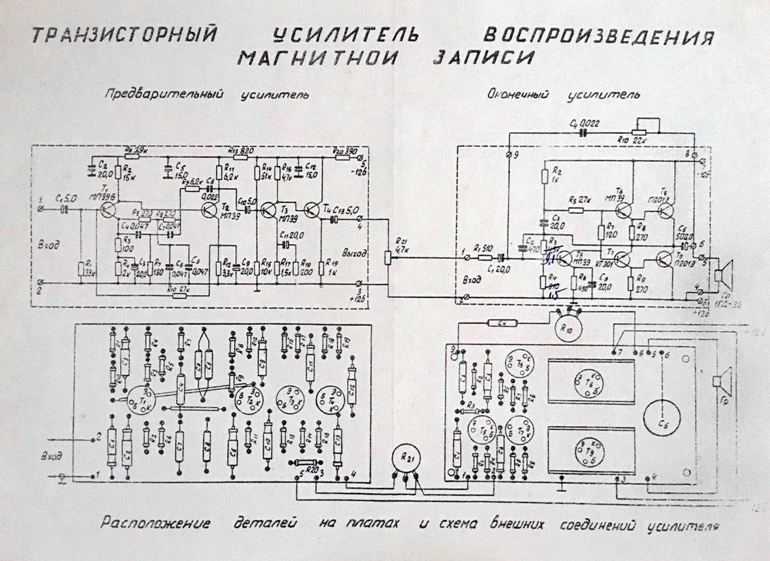 Набор деталей для радиолюбителя (Электроника) *Усилитель воспроизведения магнитной записи* выпускался возможно с 1968 года. Собранный усилитель состоит из 2-х плат усилителей, предварительного и оконечного и предназначен для усиления сигнала с магнитной головки самодельного магнитофона или магнитофонной приставки. Питание от батарей или блока питания с напряжением 12 вольт. Номинальная выходная мощность 1 Вт, максимальная более 2 Вт. Диапазон воспроизводимых звуковых частот по электрическому напряжению без подключения магнитной головки и громкоговорителя - 60...12000 Гц, через громкоговоритель идущий в наборе 1ГД-18 и с акустическим отражателем или стоящим в АС 100...10000 Гц.