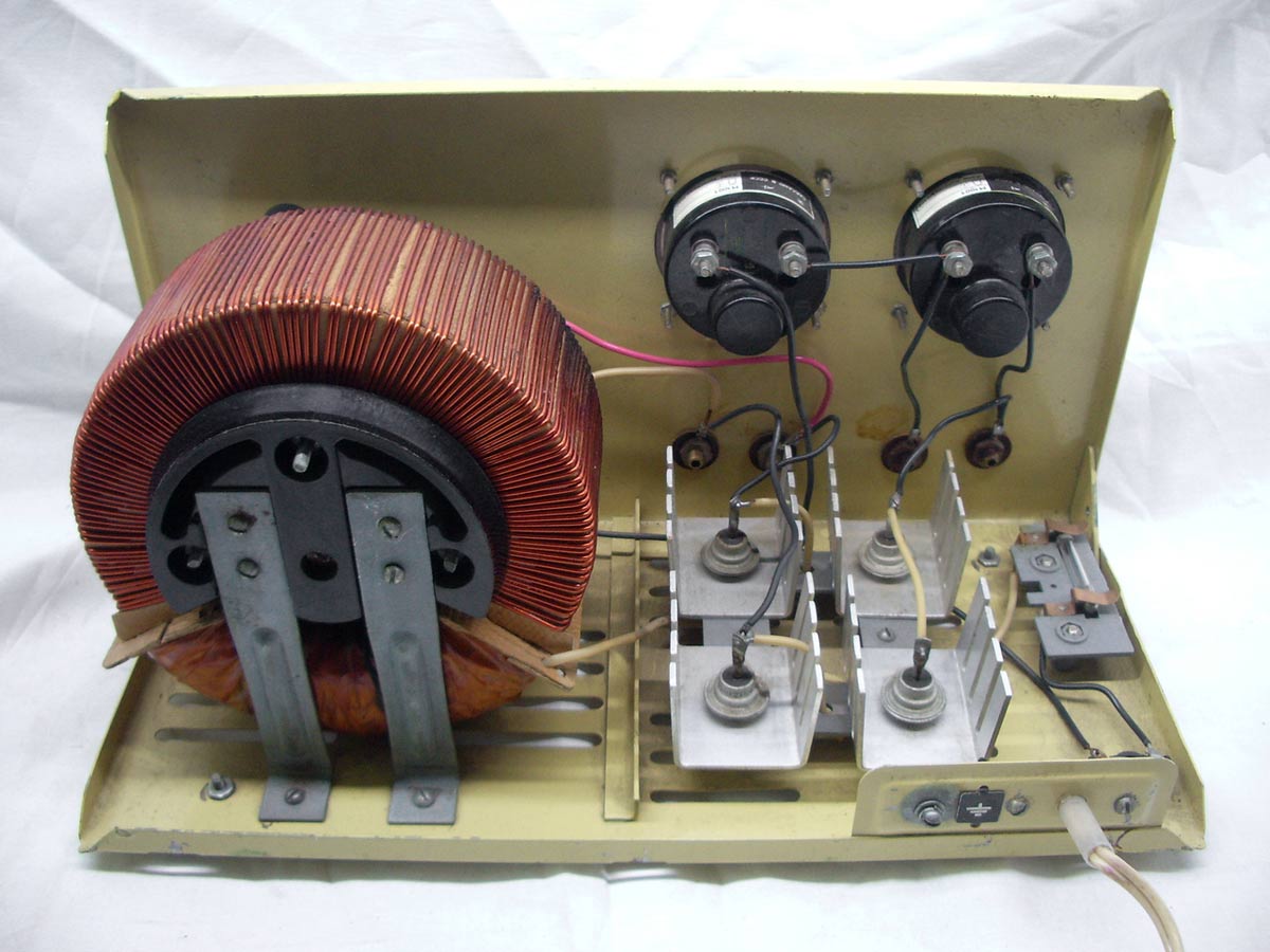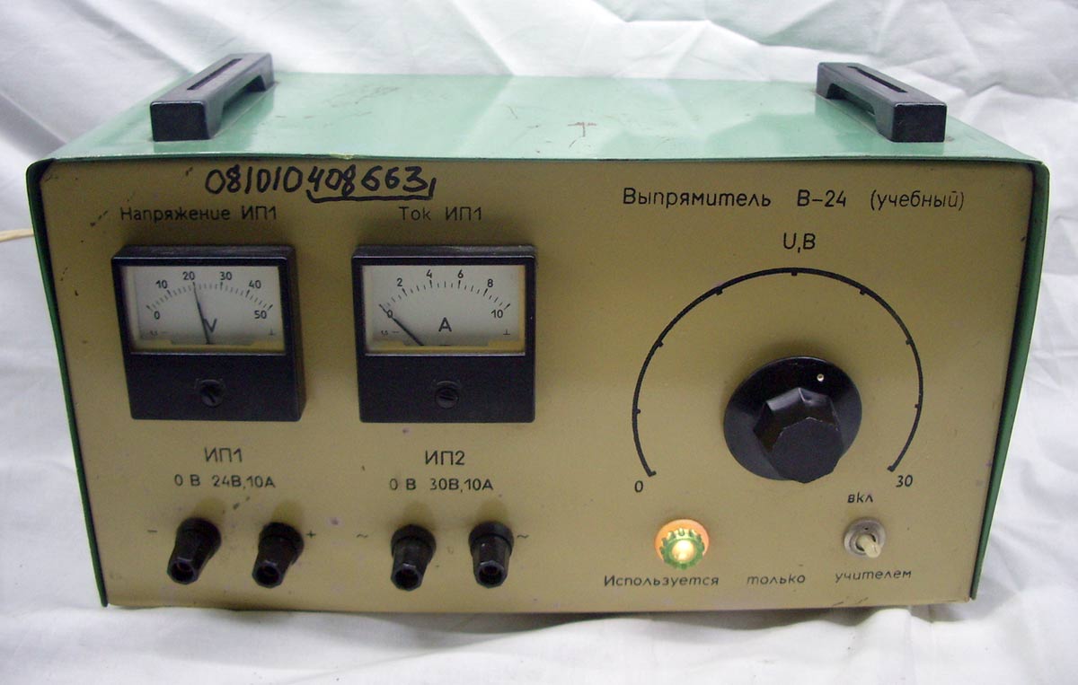 Выпрямитель учебный *В-24* выпускался с 1977 года. Предназначен для получения регулируемого напряжения переменного тока от 0 до 30 В и постоянного (пульсирующего) от 0 до 24 В при проведении работ на уроках физики в общеобразовательной школе. Питается от сети переменного тока напряжением 220 или 127 В, частотой 50 Гц. Сила тока в нагрузке до 10 А. Максимальная потребляемая мощность 500 Вт. Габариты выпрямителя 350х200х210 мм. Его масса 8,7 кг.