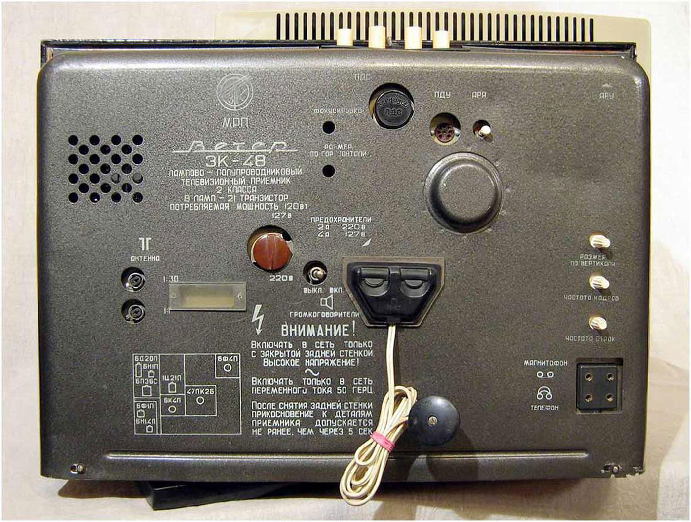 Телевизионный приёмник *Вечер* с 1965 года выпускал Ленинградский завод им. Козицкого. Лампово-полупроводниковый телевизор 2 класса *Вечер* является первым отечественным комбинированным аппаратом. От выпускавшихся ранее, он отличается не только своеобразным видом. Кроме ламп, в нём использованы транзисторы. Ещё особенность, это наличие устройства автоматической регулировки яркости, в зависимости от освещения. К аппарату можно подключить ПДУ и приставку двухречевого сопровождения. Кроме обычных регуляторов, имеется мостовой регулятор тембра по НЧ и ВЧ. Высокая экономичность, надёжность, хорошее качество изображения и звука, вот его отличительные черты. Телевизор имеет 8 ламп, 21 транзистор и 25 диодов. Кинескоп 47ЛК2Б. В АС используется два громкоговорителя 1ГД-19. Количество программ 12. Чувствительность 50 мкВ. Размер изображения 384х305 мм. Чёткость по горизонтали 450, по вертикали 500 линий. Полоса воспроизводимых звуковых частот 100...10000 Гц. Номинальная выходная мощность 1 Вт. Яркость свечения кинескопа 100 нит. Потребляемая мощность 120 Вт. Габариты модели 610х480х340 мм. Вес 25 кг. Паралельно на заводе производился аналогичный по схеме и конструкции но в другом оформлении телевизор **Вальс**, который через непродолжительное время был снят с производства.