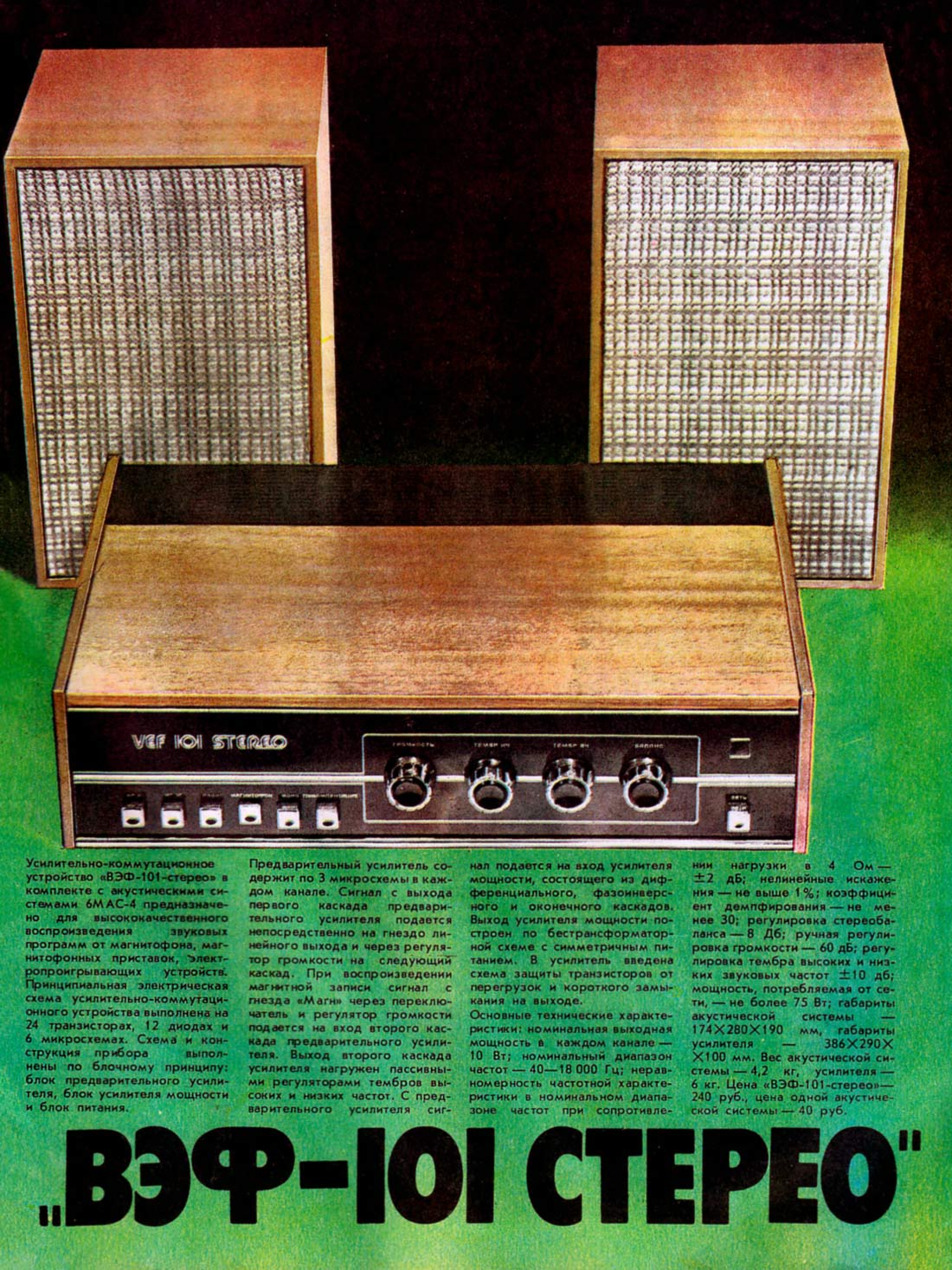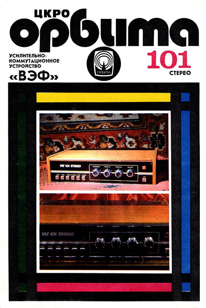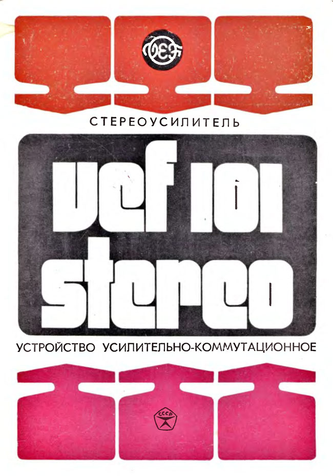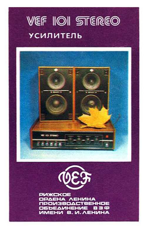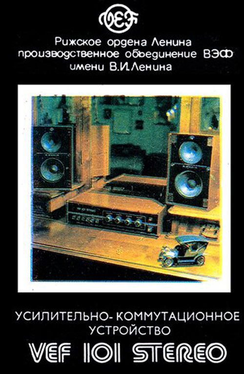 Усилительно-коммутационное устройство *ВЭФ-101-стерео* с 1977 года выпускал Государственный электротехнический завод *ВЭФ*. *ВЭФ-101-стерео* обеспечивает высококачественное усиление моно и стерео фонограм с различных источников. УКУ содержит 24 транзистора, 12 диодов, шесть интегральных микросхем, состоит из блока ПУ, блока УМ, стабилизированного БП. Сигналы с выходов каскадов первых ПУ поступают на разъём линейного выхода. При прослушивании магнитной записи сигнал через переключатель и регулятор громкости подается непосредственно на вход вторых каскадов ПУ. УКУ имеет защиту транзисторов УМ от перегрузок или коротких замыканий. В УКУ возможно прослушивание фонограмм с помощью АС и стереотелефонов, подключение магнитоэлектрического и пьезокерамического звукоснимателя. Ручки управления вынесены на переднюю панель. УКУ комплектуется АС - *6МАС-4*. Номинальная выходная мощность 2х10 Вт; диапазон рабочих частот 40..18000 Гц при неравномерности АЧХ - 5 дБ; потребляемая от сети мощность 75 Вт. Размеры усилителя 386х290х100 мм, вес 6 кг. Габариты АС - 174х280х190 мм. Масса 4,2 кг. Усилитель *ВЭФ-101-стерео* за годы своего производства неоднократно модернизировался.
