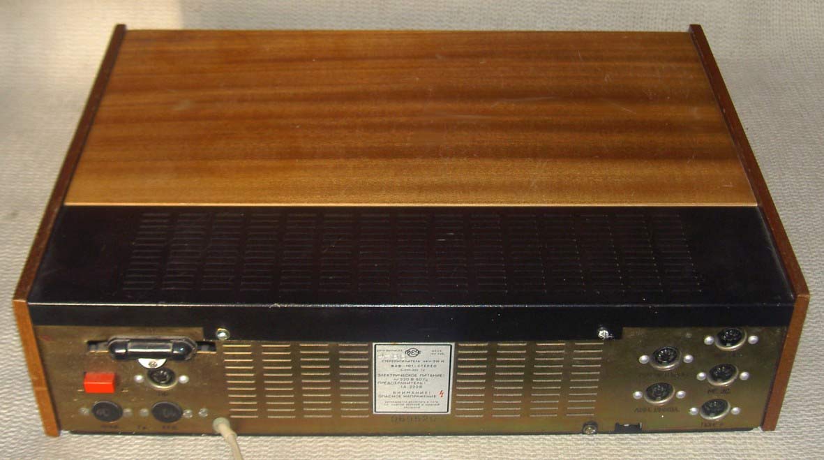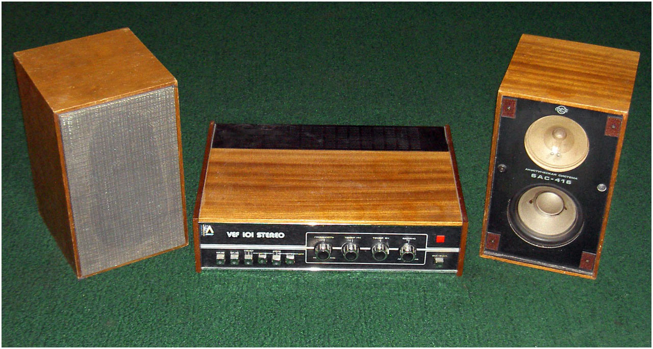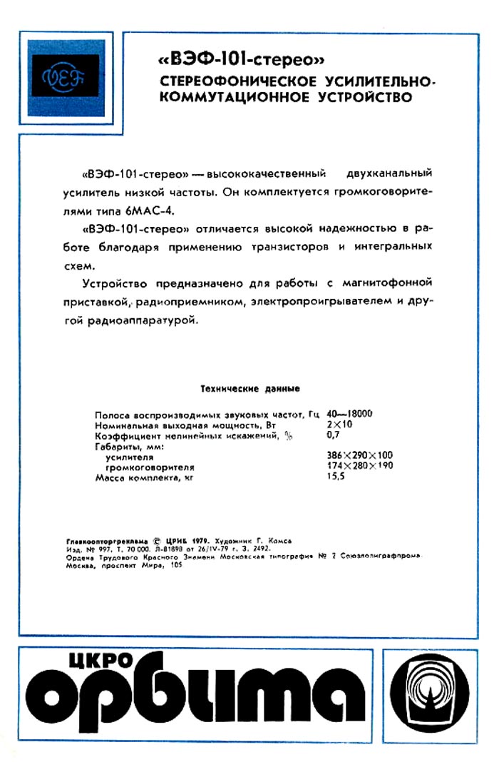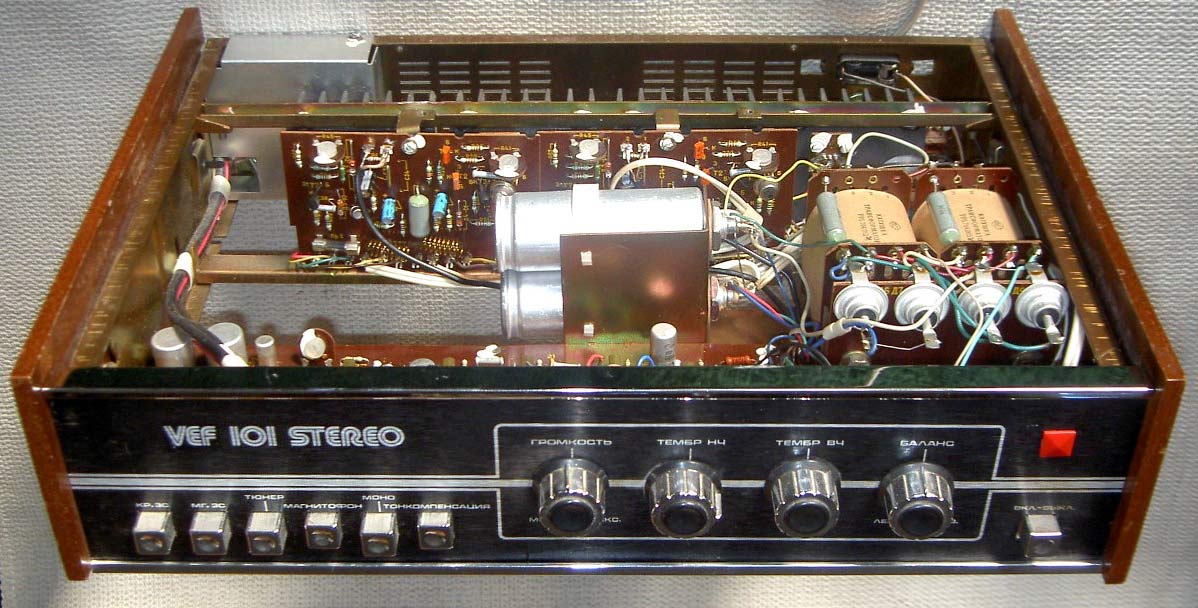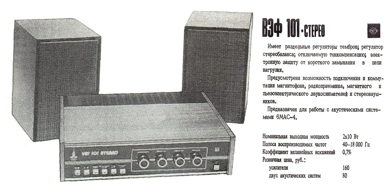 Усилительно-коммутационное устройство *ВЭФ-101-стерео* с 1977 года выпускал Государственный электротехнический завод *ВЭФ*. *ВЭФ-101-стерео* обеспечивает высококачественное усиление моно и стерео фонограм с различных источников. УКУ содержит 24 транзистора, 12 диодов, шесть интегральных микросхем, состоит из блока ПУ, блока УМ, стабилизированного БП. Сигналы с выходов каскадов первых ПУ поступают на разъём линейного выхода. При прослушивании магнитной записи сигнал через переключатель и регулятор громкости подается непосредственно на вход вторых каскадов ПУ. УКУ имеет защиту транзисторов УМ от перегрузок или коротких замыканий. В УКУ возможно прослушивание фонограмм с помощью АС и стереотелефонов, подключение магнитоэлектрического и пьезокерамического звукоснимателя. Ручки управления вынесены на переднюю панель. УКУ комплектуется АС - *6МАС-4*. Номинальная выходная мощность 2х10 Вт; диапазон рабочих частот 40..18000 Гц при неравномерности АЧХ - 5 дБ; потребляемая от сети мощность 75 Вт. Размеры усилителя 386х290х100 мм, вес 6 кг. Габариты АС - 174х280х190 мм. Масса 4,2 кг. Усилитель *ВЭФ-101-стерео* за годы своего производства неоднократно модернизировался.