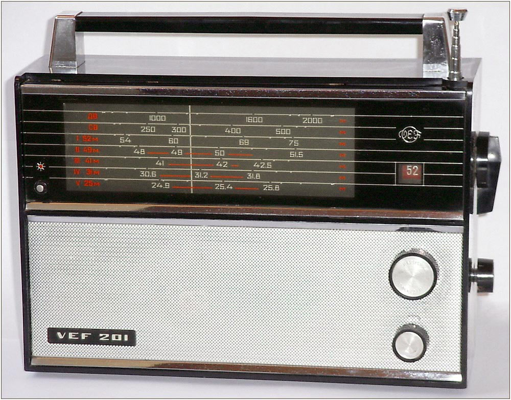 Портативный радиоприёмник *ВЭФ-201* с начала 1969 года выпускал Рижский государственный электротехнический завод *ВЭФ*. Транзисторный радиоприёмник 2-го класса **ВЭФ-201** предназначен для приёма программ радиовещательных станций в диапазонах ДВ, СВ и пяти поддиапазонах КВ. Кроме внешнего оформления - конструкция, электрическая схема (кроме небольшого упрощения) и параметры нового приёмника аналогичны приёмнику **ВЭФ-12**. Отдельно к радиоприёмникам подобного типа продавался блок питания от сети, который устанавливался в батарейный отсек. Партия экспортных радиоприёмников *ВЭФ-201* имели в комплекте кожаный чехол для лучшей сохранности радиоприёмника.