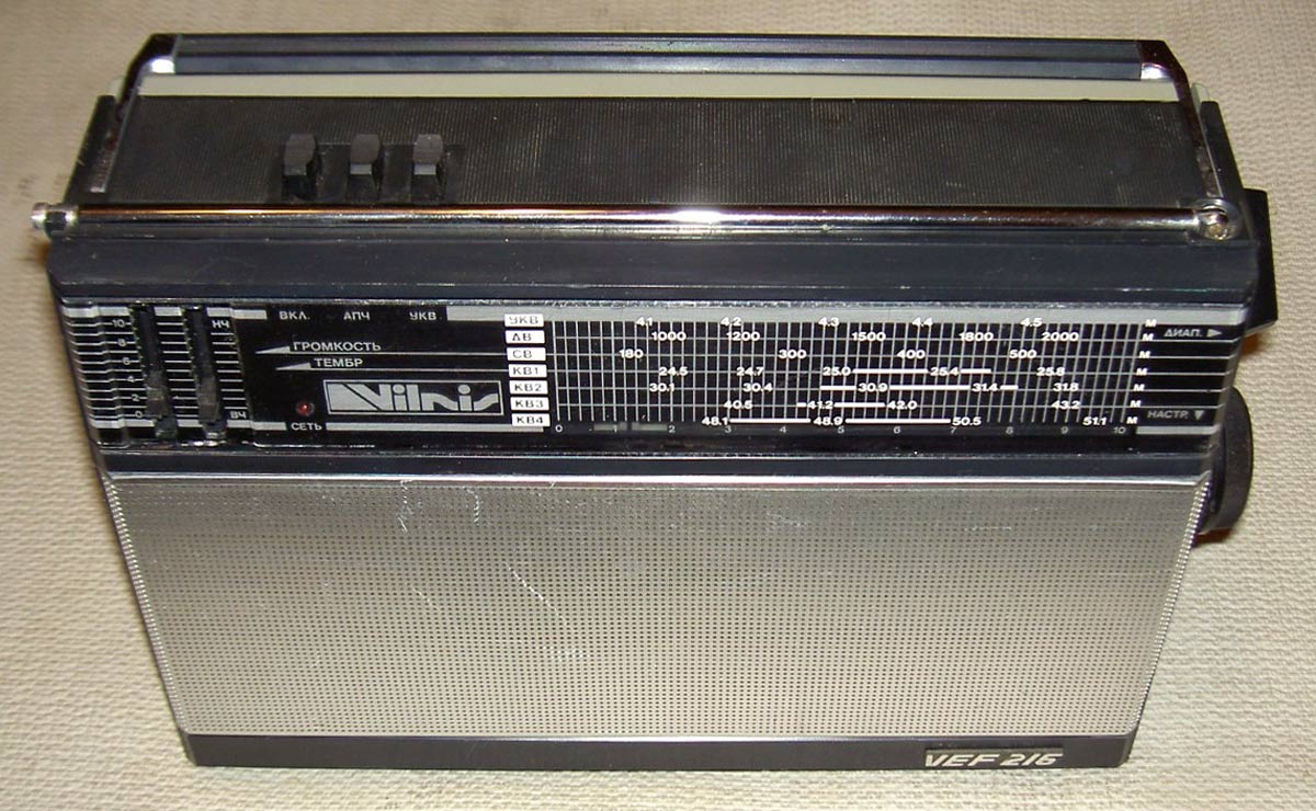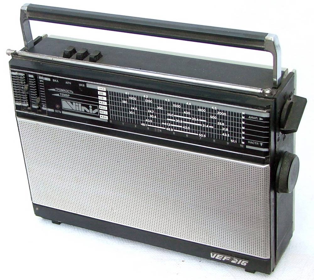 Портативный радиоприёмник *ВЭФ-216* с 1989 года выпускал Рижский радиозавод *ВЭФ*. Радиоприёмник 2-й группы сложности **ВЭФ-216** работает в 7 диапазонах: ДВ, СВ, КВ (4) и УКВ. В нём прдусмотрена АПЧ гетеродина, АРУ, бесшумная настройка, светодиодная индикация настройки на станцию. Предусмотрены гнёзда головного телефона и магнитофона. Чувствительность в диапазонах ДВ 1,5, СВ 0,7, КВ 0,3 мВ/м, УКВ 50 мкВ. Селективность 26 дБ. Полоса воспроизводимых звуковых частот при работе в ЧМ 150...10000 Гц. Номинальная выходная мощность 250 мВт. Питание универсальное, от сети или 6 элементов А-373. Потребляемый ток при отсутствии сигнала 14 мА, а при средней выходной мощности около 40 мА. Комплекта батарей при средней громкости хватит на 100 ч. работы. Габариты модели 297х247х80 мм. Масса без батарей 2,3 кг. Приёмник **ВЭФ-216** выпускали и в экспортном варианте с диапазоном FM: 88...108 МГц. По своей конструкции и электрической схеме радиоприёмник **ВЭФ-216** схож с радиоприёмником **ВЭФ-214**.