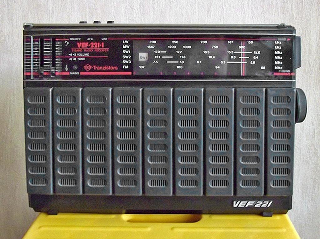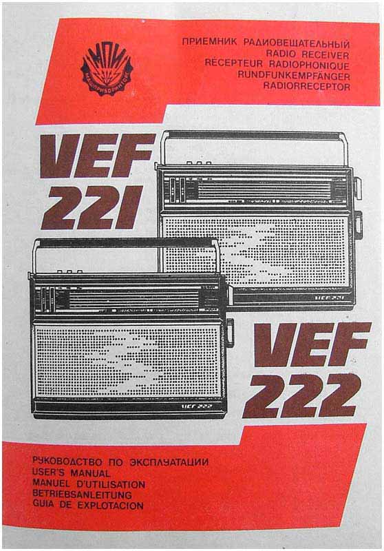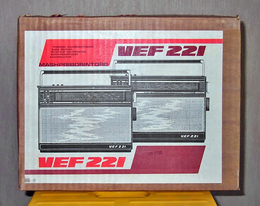 Портативный радиоприёмник *VEF-221* выпускался с 1988 года Рижским ПО *ВЭФ*. Радиоприёмник 2 группы сложности **VEF-221** поставлялся на экспорт. Диапазоны: ДВ, СВ, КВ-1 17,9...15,0 МГц, КВ-2 9,4...12,1 МГц, КВ-3 5,9...7.5 МГц и УКВ 88...108 МГц. В модели имеется система АПЧГ, АРУ, бесшумная настройка. Есть гнездо для головного телефона сопротивлением 50...120 Ом, гнездо магнитофона. Для приёма в диапазонах ДВ, СВ приёмник имеет внутреннюю магнитную антенну, а в диапазонах КВ (SW) выдвижную, телескопическую. Приём может осуществляться и на наружную антенну. Чувствительность в диапазоне ДВ - 1,5 мВ/м, СВ - 0,7мВ.м, КВ - 0,3 мВ/м, УКВ - 50 мкВ. Селективность - 26 дБ. Полоса частот при работе на УКВ - 150...10000 Гц. Номинальная выходная мощность 250 мВт. Питание от сети или 6 элементов 373. Потребляемый ток без сигнала 14 мА. Комплекта батарей при средней громкости хватает на 100 часов. Размер приёмника 297х247х80 мм, масса без батарей 2,3 кг. С 1992 года выпускался радиоприёмник *VEF-221-1*, который кроме наименования полностью аналогичен описанному выше.
