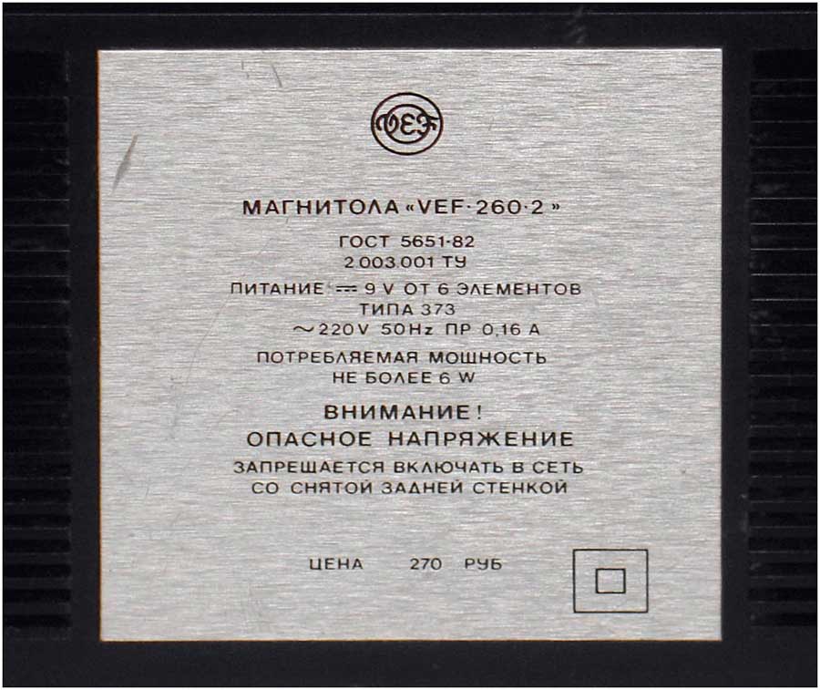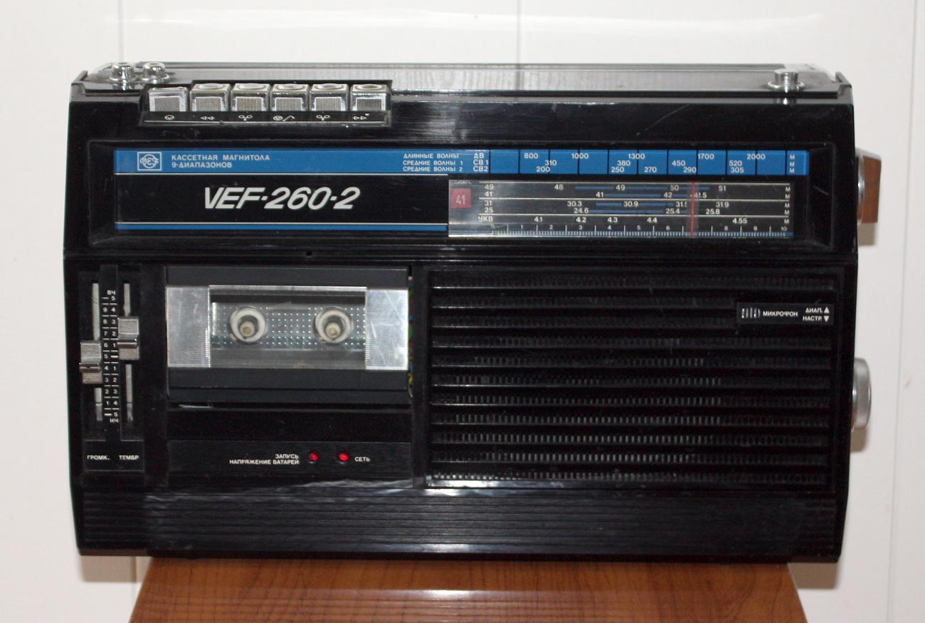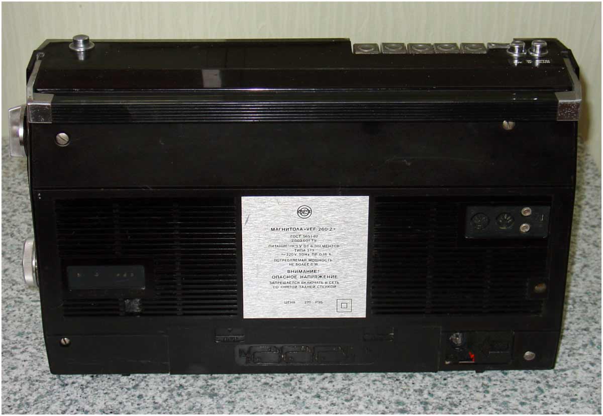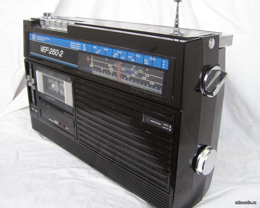 Переносная кассетная магнитола *ВЭФ-260-2* с 1984 года выпускал Рижский Государственный электротехнический завод ВЭФ. Это модернизация магнитолы **Вэф-260**. По конструкции и схеме, кроме оформления магнитолы не отличаются. В магнитоле предусмотрены: Девять диапазонов: ДВ, два СВ, УКВ и пять КВ. АПЧ в УКВ диапазоне. Световой индикатор настройки. Электретный микрофон. АРУЗ. Временная остановки магнитной ленты. Переключатель отстройки от помех при записи с приёмника. Регулятор тембра по ВЧ и НЧ. Питание: сеть или 6 элементов 373. Номинальная выходная мощность 0,5, максимальная 1,2 Вт. Чувствительность в диапазонах ДВ - 2 мВ/м, СВ - 1,5 мВ/м, КВ 0,2 мВ/м, УКВ 0,05 мВ/м. Диапазон частот в АМ - 125...4000 Гц, ЧМ - 125...10000 Гц, записи 60...10000 Гц. Отношение сигнал/шум в канале записи -44 дБ. Коэффициент детонации 0,35%. Габариты магнитолы 417х240х106 мм. Вес с батареями 4,4 кг.