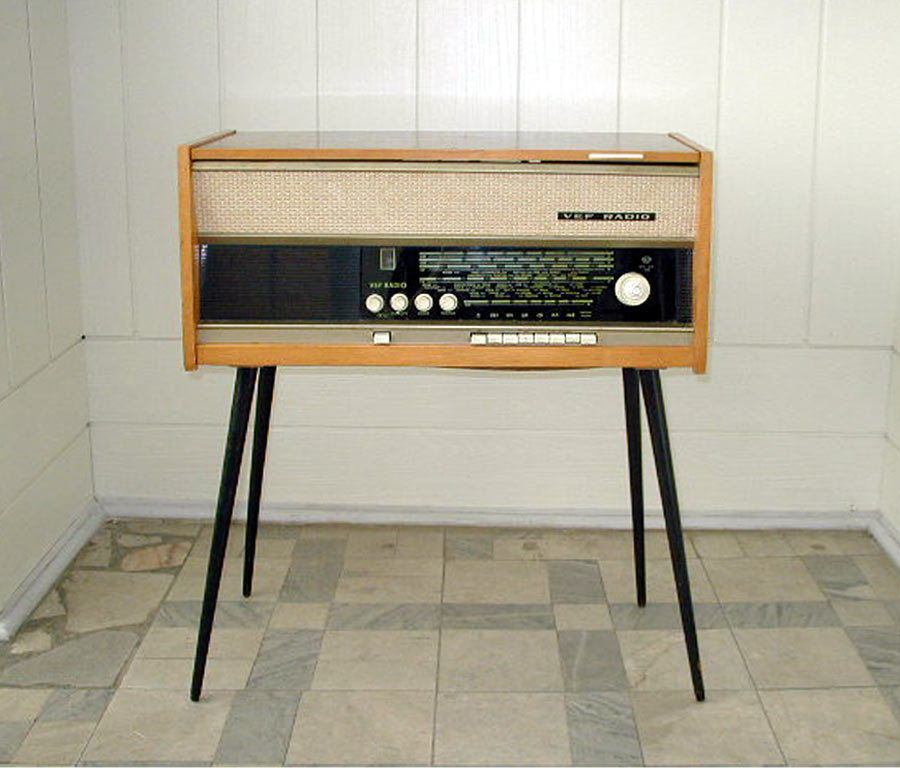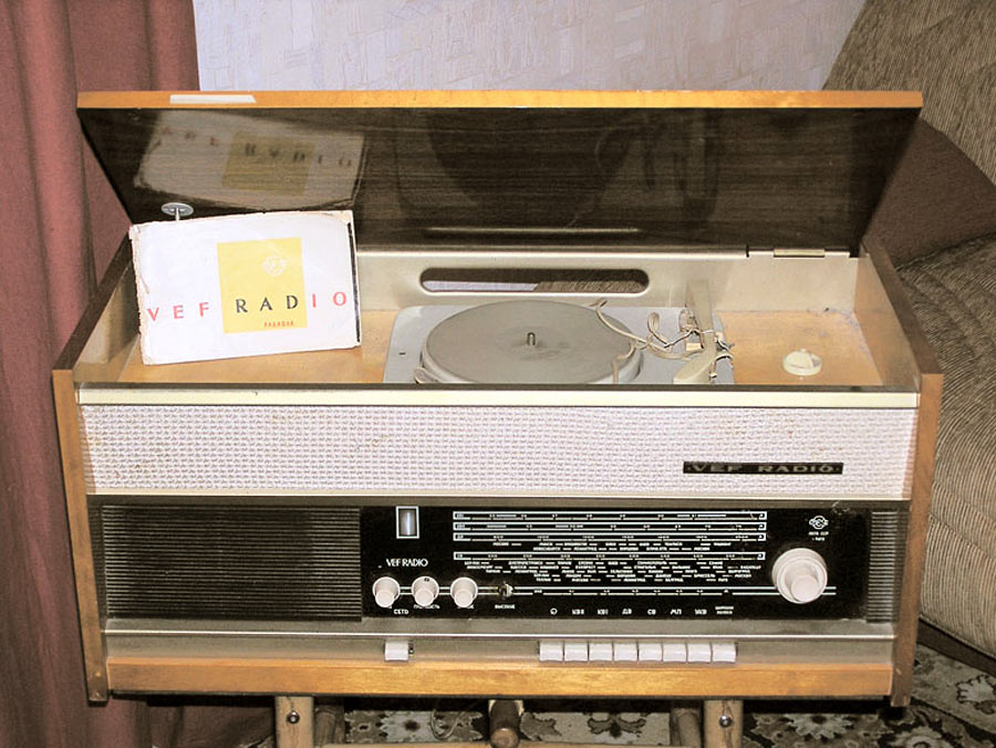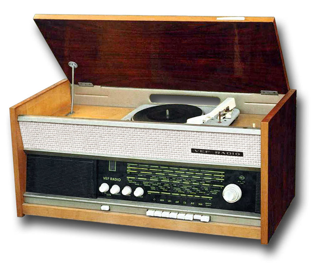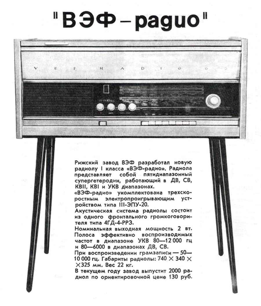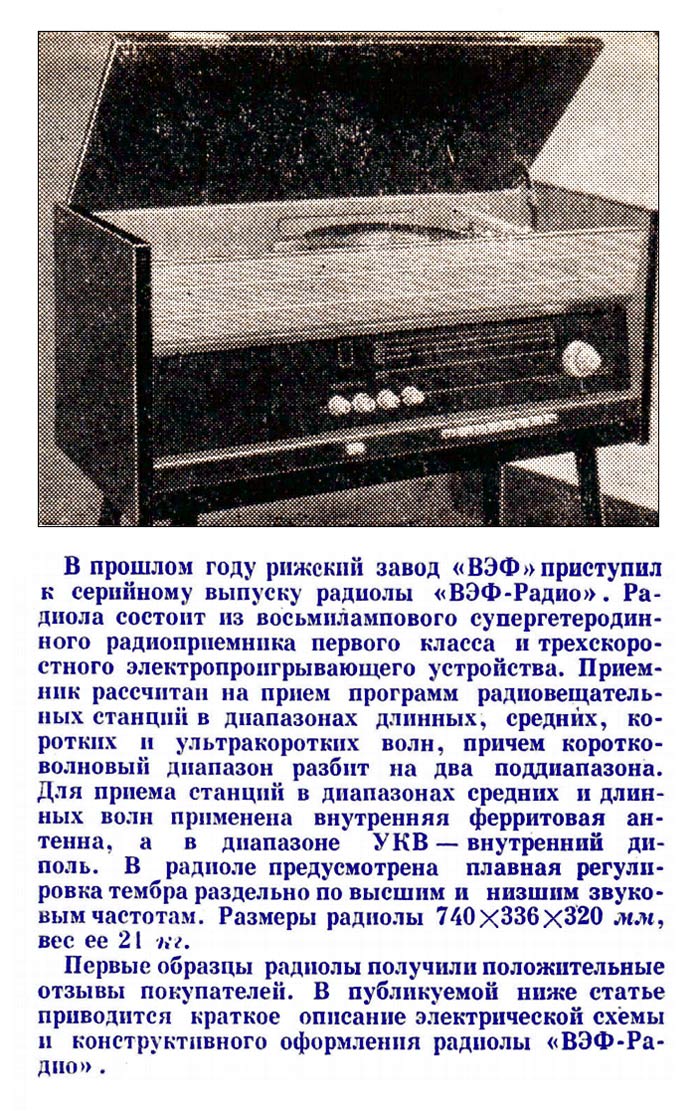 Радиола *Вэф-Радио* (**ВЭФ-Радио-65**) с начала 1965 года выпускалась Рижским электротехническим заводом *ВЭФ*. Радиола состоит из 8-ми лампового супергетеродинного приёмника первого класса и 3-х скоростного электропроигрывающего устройства III-ЭПУ-20 (II-ЭПУ-40). Радиоприёмник рассчитан на приём в диапазонах ДВ, СВ, КВ и УКВ, КВ диапазон разбит на два поддиапазона. В радиоле имеется плавная регулировка тембра по ВЧ и НЧ. Принципиальная схема радиолы схожа со схемой радиолы **Ригонда-моно** за исключением небольших изменений в номиналах элементов в блоке КСДВ-ПЧ и БП и отличается оформлением футляра, который может быть напольным и (или) настольным. АС состоит из громкоговорителя 4ГД-4. Размеры радиолы 740х336х320 мм. Масса 21 кг. Диапазоны: ДВ 150...408 кГц, СВ 525...1605 кГц, КВ-1 3,95...7,4 МГц, КВ-2 9,1...12 МГц и УКВ 65,8...73 МГц. Чувствительность с внешней антенной в диапазонах ДВ, СВ, КВ - 50 мкВ, в диапазоне УКВ 5 мкВ. Чувствительность с магнитной антенной в диапазонах ДВ, СВ 1,5 мВ/м. В тракте AM, ПЧ 465 кГц, ширина полосы пропускания при ослаблении сигнала 6 дБ в положении **узкая полоса** 5 кГц, **широкая полоса** 11 кГц и в положении **местный приём** 15 кГц. В тракте ЧМ, ПЧ 6,5 МГц, полоса пропускания 150 КГц. Избирательность по AM тракту 60 дБ. АРУ обеспечивает изменение сигнала на выходе на 11 дБ при изменении на входе на 40 дБ. Максимальная выходная мощность 3,5 Вт. Диапазон рабочих частот AM тракта 80...6000 Гц, ЧМ тракта 80...12000 Гц, грамзаписи 80..10000 Гц. ЭПУ снабжён автовыключателем и микролифтом и рассчитан на воспроизведение пластинок на скоростях 78, 45 и 33 об/мин. Потреблямая мощность при приёме 60 Вт, а при прослушивании грамзаписи 75 Вт.