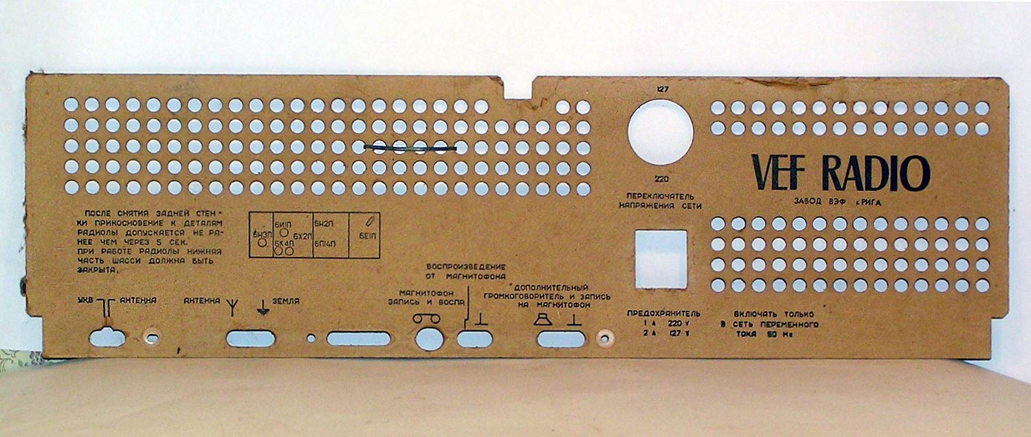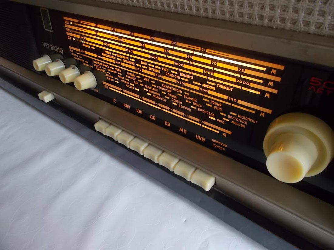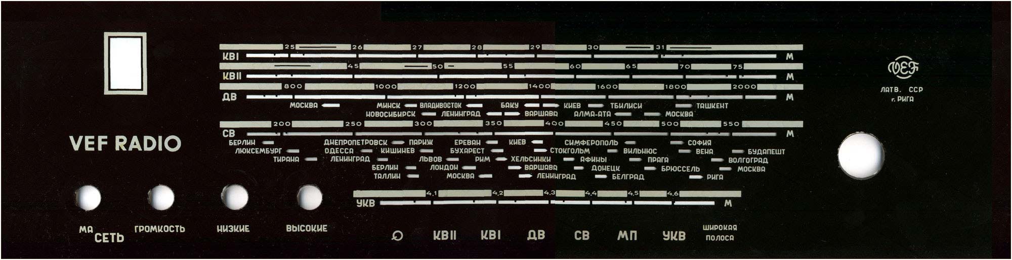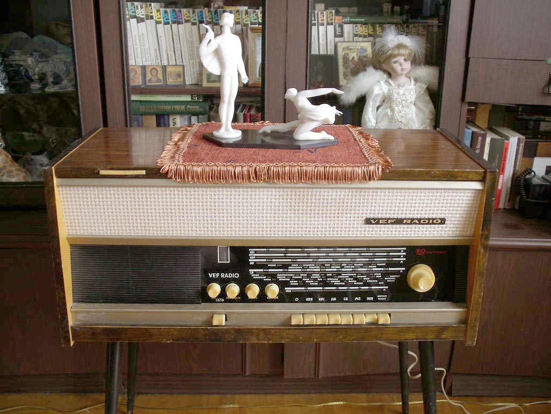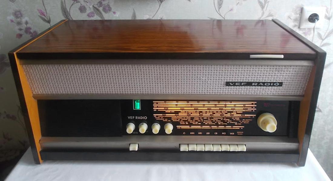 Радиола *Вэф-Радио* (**ВЭФ-Радио-65**) с начала 1965 года выпускалась Рижским электротехническим заводом *ВЭФ*. Радиола состоит из 8-ми лампового супергетеродинного приёмника первого класса и 3-х скоростного электропроигрывающего устройства III-ЭПУ-20 (II-ЭПУ-40). Радиоприёмник рассчитан на приём в диапазонах ДВ, СВ, КВ и УКВ, КВ диапазон разбит на два поддиапазона. В радиоле имеется плавная регулировка тембра по ВЧ и НЧ. Принципиальная схема радиолы схожа со схемой радиолы **Ригонда-моно** за исключением небольших изменений в номиналах элементов в блоке КСДВ-ПЧ и БП и отличается оформлением футляра, который может быть напольным и (или) настольным. АС состоит из громкоговорителя 4ГД-4. Размеры радиолы 740х336х320 мм. Масса 21 кг. Диапазоны: ДВ 150...408 кГц, СВ 525...1605 кГц, КВ-1 3,95...7,4 МГц, КВ-2 9,1...12 МГц и УКВ 65,8...73 МГц. Чувствительность с внешней антенной в диапазонах ДВ, СВ, КВ - 50 мкВ, в диапазоне УКВ 5 мкВ. Чувствительность с магнитной антенной в диапазонах ДВ, СВ 1,5 мВ/м. В тракте AM, ПЧ 465 кГц, ширина полосы пропускания при ослаблении сигнала 6 дБ в положении **узкая полоса** 5 кГц, **широкая полоса** 11 кГц и в положении **местный приём** 15 кГц. В тракте ЧМ, ПЧ 6,5 МГц, полоса пропускания 150 КГц. Избирательность по AM тракту 60 дБ. АРУ обеспечивает изменение сигнала на выходе на 11 дБ при изменении на входе на 40 дБ. Максимальная выходная мощность 3,5 Вт. Диапазон рабочих частот AM тракта 80...6000 Гц, ЧМ тракта 80...12000 Гц, грамзаписи 80..10000 Гц. ЭПУ снабжён автовыключателем и микролифтом и рассчитан на воспроизведение пластинок на скоростях 78, 45 и 33 об/мин. Потреблямая мощность при приёме 60 Вт, а при прослушивании грамзаписи 75 Вт.