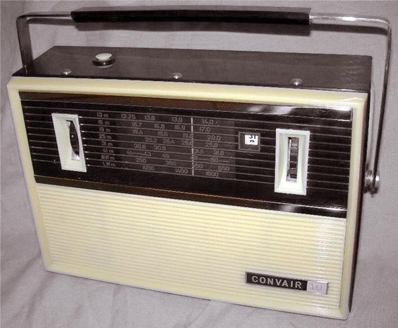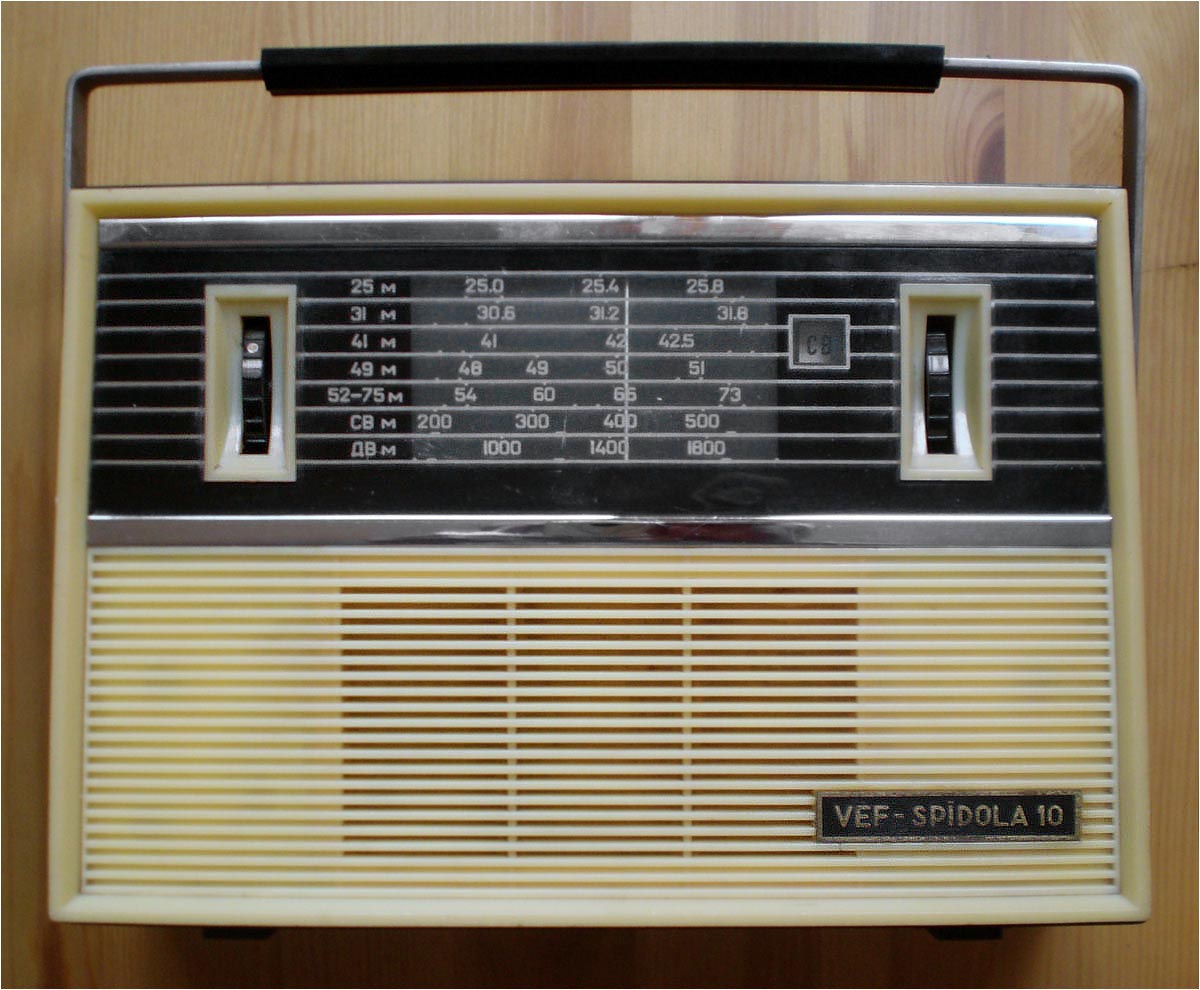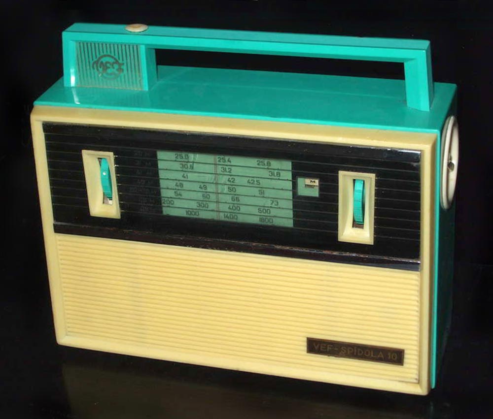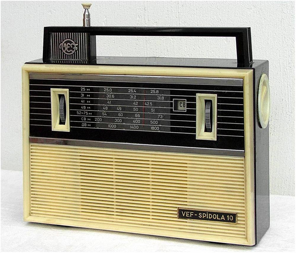 Портативный транзисторный радиоприёмник *ВЭФ-Спидола-10* с 1965 года выпускал Государственный электротехнический завод *ВЭФ*. Радиоприемник *ВЭФ-Спидола-10* (ПМК-65) выпускался совместно с радиоприёмником *ВЭФ-Спидола* для увеличения ассортимента выпускаемой заводом продукции и кроме оформления схож с ним. Он собран на 10 транзисторах и двух диодах и предназначен для приёма радиовещательных станций в диапазонах: ДВ, СВ и КВ. КВ диапазон разбит на 5 поддиапазонов (4 растянутых и 1 полурастянутый). Переключение диапазонов производится при помощи барабанного переключателя. В диапазонах ДВ, СВ приём осуществляется на магнитную антенну, а в диапазоне KB - на выдвижную телескопическую. Максимальная выходная мощность приёмника 250 мВт. Питание от шести элементов Сатурн или двух батарей КБС-Л-0,5. Потребление тока зависит от уровня сигнала в выходном каскаде, при напряжении питания 9 В и выходной мощности 150 мВт оно равно 50 мА. При ежедневной работе приёмника в течение 3-х часов комплекта батарей А-373 хватает на 200 часов. Приёмник имеет эффективную систему АРУ, ручную регулировку уровня громкости, гнёзда для внешнего пьезоэлектрического звукоснимателя, АС, антенны и питания. Габариты радиоприёмника *ВЭФ-Спидола-10* - 275х197х90 мм, масса без батарей - 2,2 кг.