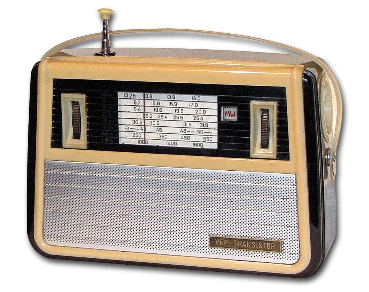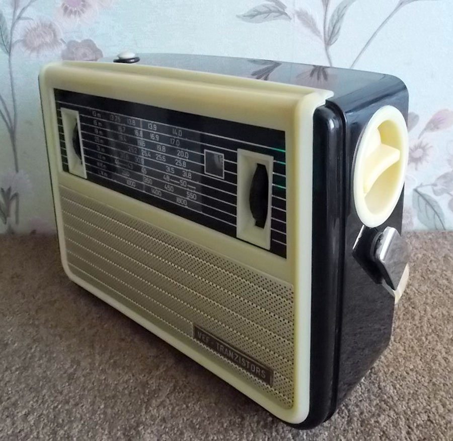 Портативный радиоприёмник *ВЭФ-Транзистор* с 1965 года выпускал Рижский Государственный электротехнический завод *ВЭФ*. **VEF-Transistor** - экспортный вариант серийного радиоприёмника **ВЭФ-Спидола**. Экспортный радиоприёмник это полный аналог базового, за исключением поддиапазонов коротких волн, значения которых соответствуют стандартам принятым в Европейских странах. *VEF-Transistor* - переносный приёмник на 10 транзисторах. Работает он в диапазонах длинных, средних и коротких (поддиапазоны 13, 16, 19, 25, 31 метр и растянутый диапазон 41...52 метра) волн. Для тропических стран был диапазон перекрывающий промежуточные волны от 85 до 200 метров. Чувствительность приёмника с магнитной антенной на ДВ, СВ - 0,5...1,0 мВ/м. На КВ поддиапазонах с штыревой антенной - 50 мкВ. Номинальная выходная мощность 150 мВт. Диапазон воспроизводимых частот 350...4000 Гц. Питание от 2-х батарей КБС-Л-0,5 или от 6-ти Сатурн. Размеры приёмника 280х230х92 мм. Масса 2,4 кг. По общей схеме и конструкции, но в других футлярах и с другими шкально верньерными устройствами завод выпускал модели **Спидола**, **Вэф-Спидола** и **Вэф-Спидола-10**.