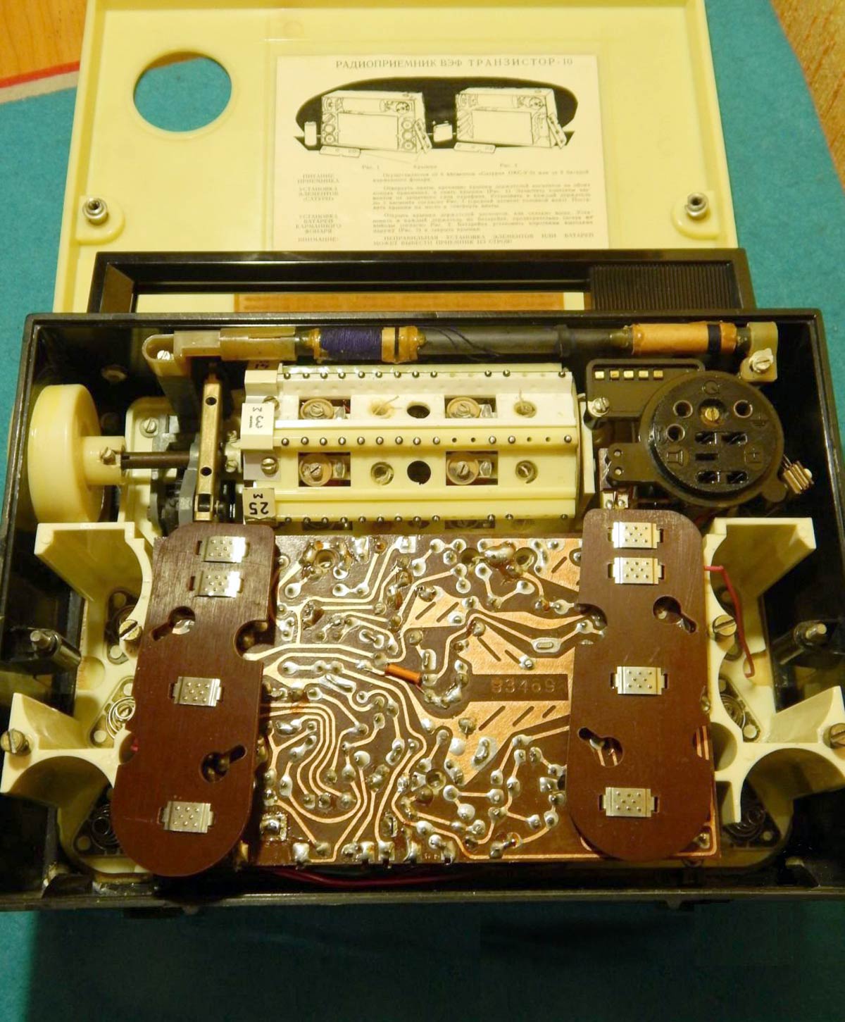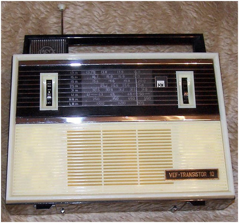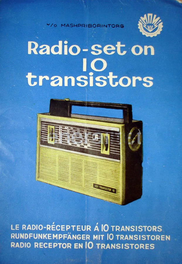 Радиоприёмник *ВЭФ-Транзистор-10* с 1965 года выпускал Рижский Государственный завод *ВЭФ*. **ВЭФ-Транзистор-10** - это переносный радиоприёмник на 10 транзисторах. Он работает в диапазонах: ДВ, СВ и поддиапазонах КВ - 25, 31, 41, 49, 75 метров. Экспортный вариант имел КВ поддиапазоны: 13, 16 и 19 метров, но в нём были убраны поддиапазоны 49 и 75 метров. Были и экспортные варианты приёмники перекрывающие промежуточные волны 85..200 метров. Чувствительность приёмника с магнитной антенной на ДВ, СВ - 1,0...1,5 мВ/м. На КВ поддиапазонах со штыревой антенной - 60 мкВ. Номинальная выходная мощность 150 мВт, диапазон звуковых частот воспроизводимых громкоговорителем 350...3500 Гц. Питается приёмник от 2-х батарей КБС-Л-0,5 или 6-ти элементов Сатурн. Габариты приёмника - 280х230х92 мм, масса 2,4 кг. Для увеличения ассортимента по практически одинаковой электрической схеме и конструкции, за исключением корпусов и шкально верньерных устройств завод выпускал приёмники **ВЭФ-Спидола**, **ВЭФ-Спидола-10**, *ВЭФ-Транзистор* и их экспортные аналоги.