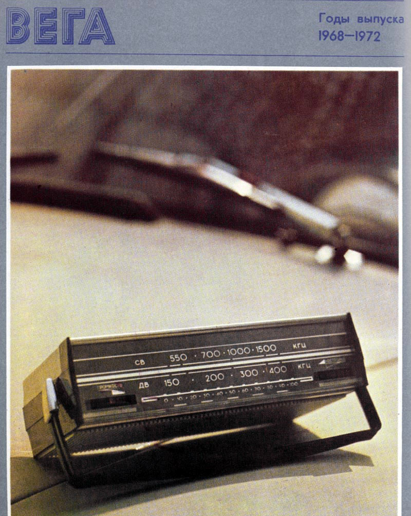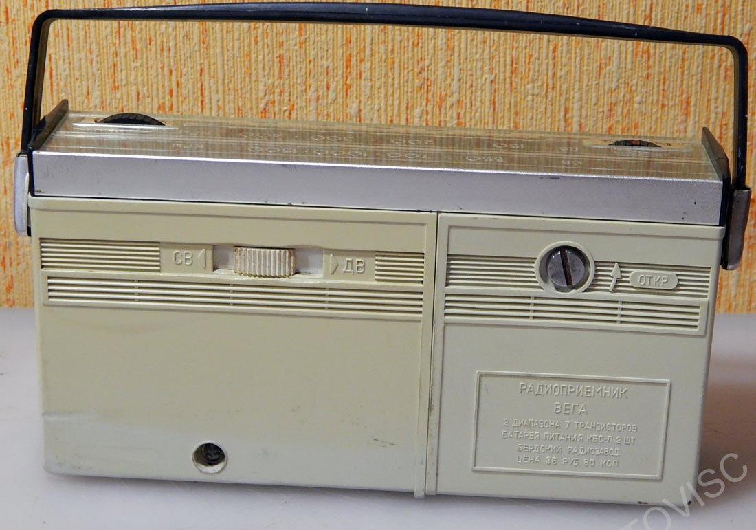 Портативный транзисторный радиоприёмник *Вега* с 1968 по 1972 год выпускал Бердский радиозавод. *Вега* первый портативный транзисторный приёмник Бердского радиозавода. Он создан на базе модели *РИГА-301Б* Рижского завода имени Попова 1966 года выпуска. До конца 1968 года радиоприёмник *Вега* имел схожий с базовой моделью вид. Переносной радиоприёмник 4 класса **Вега** предназначен для приёма радиостанций в диапазонах ДВ, СВ на магнитную антенну. Чувствительность в диапазонах ДВ - 2,5, СВ - 1,5 мВ/м. Избирательность по соседним каналам - 26 дБ. Полоса воспроизводимых звуковых частот - 350...3500 Гц. Номинальная выходная мощность на громкоговорителе 0,25 ГД-1 - 150 мВт. В приёмнике имеются гнёзда для внешнего громкоговорителя, головного телефона, наружной антенны и заземления. Питается радиоприёмник от двух батарей КБСЛ-336, общим напряжением 9 вольт или от батареи Крона. Размеры приёмника 203х110х52 мм, масса без батарей 750 гр. Цена - 36 рублей 80 копеек. Бердский радиозавод закончил производство радиоприёмника **Вега** в ноябре 1971 года заменив его новым радиоприёмником **Вега-402**.