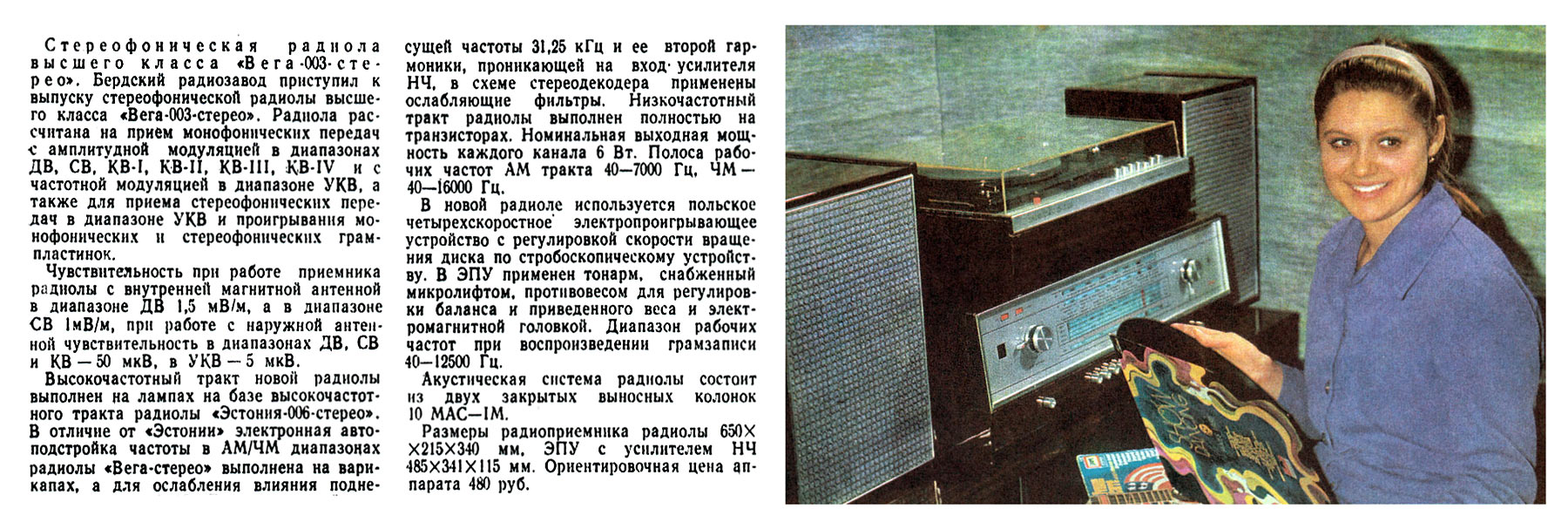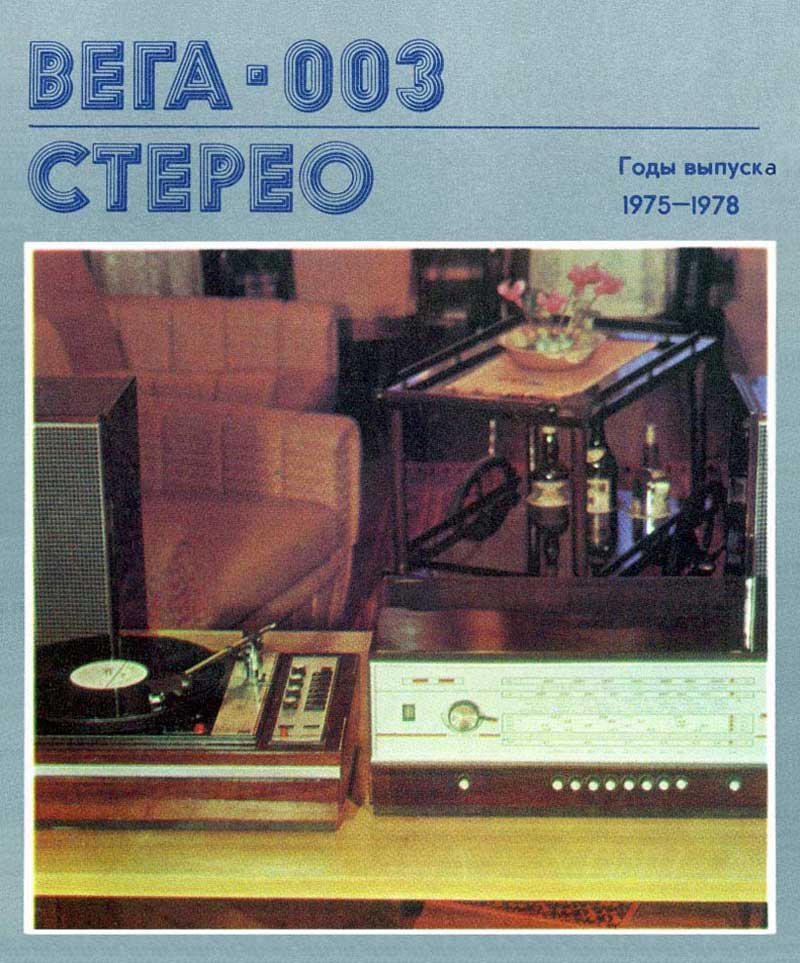 Радиола *Вeгa-003-стерео* с середины 1974 года выпускалась Бердским радиозаводом. Стереофоническая радиола высшего класса **Вега-001-стерео** из-за применённого ЭПУ типа II-ЭПУ-62С Рижского ЭМЗ в электрофоне *Вега ЭПУ-НЧ* (*Вега-103*) не могла быть радиолой высшего класса, поэтому через 5 месяцев радиола была заменена на модель **Вега-003-стерео**, где в качестве ЭПУ и усилителя использовался электрофон **Вега-002-стерео** с ЭПУ высшего класса *Унитра*, он описан отдельно. В тюнере были заменены надписи на шкале и задней стенке. Радиола **Вега-003-стерео** рассчитана на приём в диапазонах ДВ, СВ, KB-1...КВ-5 и с ЧМ в диапазоне УКВ и для приёма стереофонических передач в диапазоне УКВ и проигрывания моно и стереофонических грампластинок всех форматов. Чувствительность с внутренней магнитной антенной в диапазонах ДВ 1,5 мВ/м, СВ 1 мВ/м, а при работе с наружной антенной чувствительность в диапазонах: ДВ, СВ и KB - 50 мкВ, УКВ-ЧМ - 5 мкВ. ВЧ тракт радиолы ламповый, полностью повторяя модель **Вега-001-стерео**. Номинальная выходная мощность УНЧ - 2х6 Вт. Полоса воспроизводимых частот AM тракта - 40...7000 Гц, ЧМ - 40...16000 Гц. Электрофон имеет 4-х или 3-х скоростное ЭПУ с регулировкой скорости вращения диска по стробоскопу. В нём применён тонарм с микролифтом, противовесом регулировки баланса и приведённого веса с электромагнитной головкой. Диапазон частот при прослушивании грамзаписи 40...18000 Гц. АС состоит из 2-х АС *10MAC-1M*. Размеры радиоприёмника 650х215х340 мм. ЭПУ с усилителем (электрофона) 485х341х115 мм.
