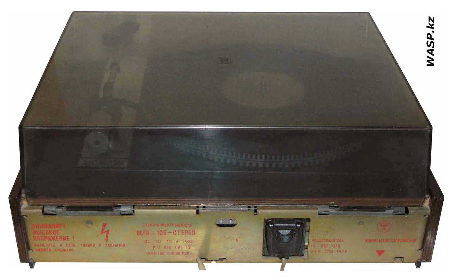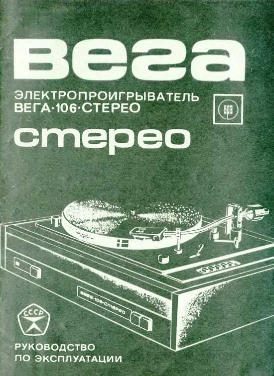 Стереофонический электропроигрыватель 1-го класса *Вега-106-стерео* с 1976 года выпускал Бердский радиозавод. Предназначен для проигрывания грампластинок всех форматов на скорости вращения диска 16, 33 и 45 об/мин, позже (с 1978 года) только 33 и 45 об/мин. B проигрывателе применён магнитоэлектрический звукосниматель, есть подстройка частоты вращения диска по стробоскопу, статическая балансировка звукоснимателя, регулировка приведённого веса и микролифт. Диапазон рабочих частот с ЛВ 31,5...16000 Гц. Потребляемая мощность 30 Вт. Размеры ЭП - 410х350х170 мм. Масса 13 кг. Цена 160 рублей. ЭП выпускалась на две скорости с ЭПУ G-600 и G-602, но в первых выпусках ставили даже четырёхскоростное (16, 33, 45 и 78 об/мин) ЭПУ с механическим приводом.