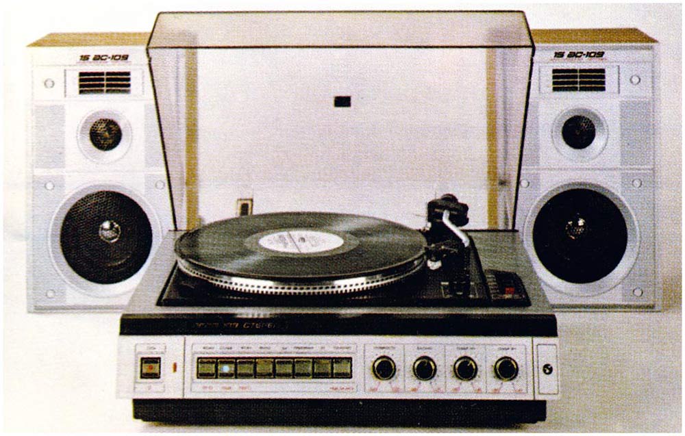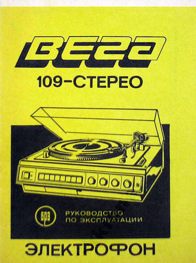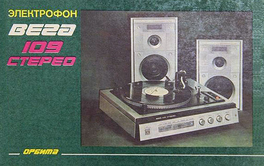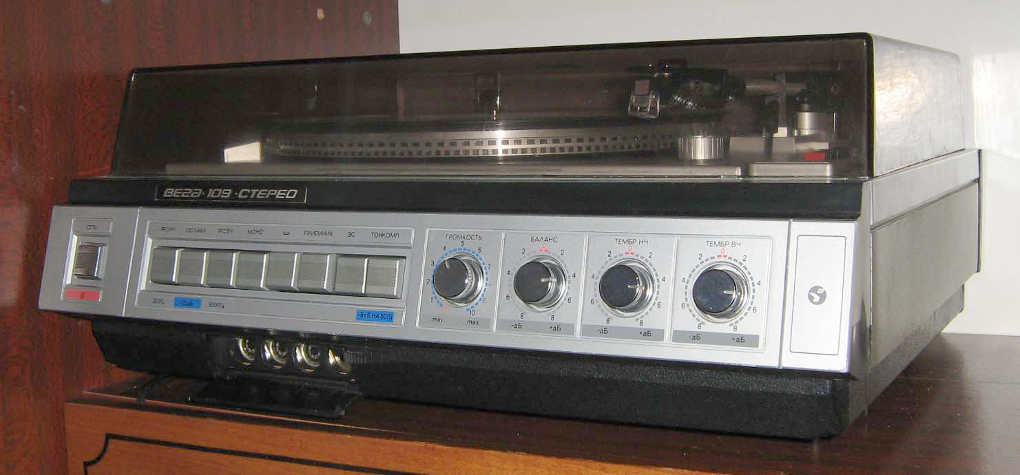 Электрофон сетевой транзисторный *Вега-109-стерео* с 1985 года выпускал Бердский радиозавод. Электрофон имеет двухскоростное ЭПУ - G-602-С производства ПНР, раздельные регуляторы тембра НЧ, ВЧ, регулятор стереобаланса, фильтры НЧ и ВЧ, отключаемую тонкомпенсацию, ступенчатый регулятор громкости, регулировку частоты вращения диска со стробоскопом, автостоп, микролифт. В комплект электрофона входят две АС 15АС-109. Номинальная выходная мощность 2х10 Вт. Диапазон воспроизводимых частот звука - 50...18000 Гц. Потребляемая мощность 80 Вт. Уровень фона, минус 50 дБ. Коэффициент детонации ЭПУ 0,15 %. Тип звукоснимателя MF-101. Габариты электрофона - 465х210х428 мм. Габариты одной АС 360х220х190 мм. Масса электрофона 15 кг, масса одной АС 7 кг.
