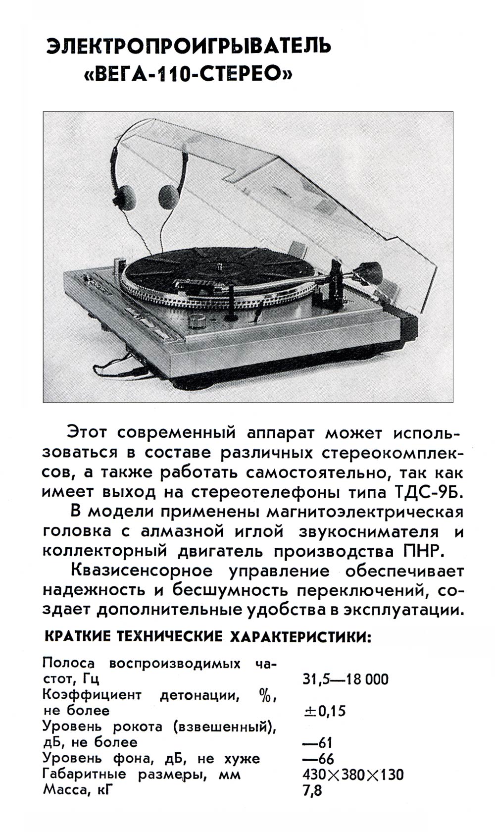 Электропроигрыватель *Вега ЭП-110С* с 1984 года выпускал Бердский радиозавод. Электропроигрыватель **Вега ЭП-110 стерео** (до 1987 года **Вега-110-стерео**) предназначен для работы в составе комплексов бытовой аппаратуры. ЭП предназначен для воспроизведения грамзаписи с моно и стереофонических грампластинок, с прослушиванием на стереофонические телефоны или внешнее УКУ. В ЭП установлено ЭПУ типа *G-602М* с квазисенсорным управлением производства ПНР в котором используется магнитоэлектрическая головка *МF-100*. Частота вращения диска - 33,33 и 45 об/мин. Коэффициент детонации не более 0,15%. Номинальный диапазон воспроизводимых звуковых частот - 31,5...16000 Гц. Номинальная выходная мощность телефонного усилителя 100 мВт. Габариты аппарата 430х380х130 мм. Масса 10 кг. Цена модели - 159 рублей.