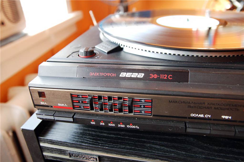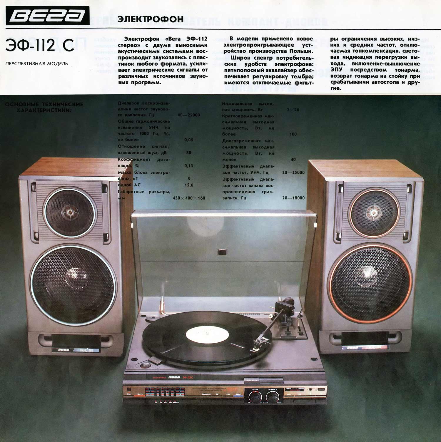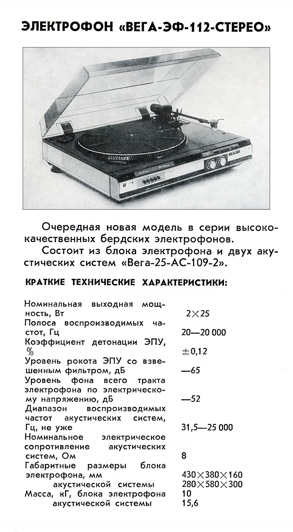 Электрофон сетевой транзисторный *Вега ЭФ-112-стерео* с начала 1985 года выпускал Бердский радиозавод. Стереофонический электрофон первой группы сложности *Вега ЭФ-112-стерео* предназначен для высококачественного воспроизведения грамзаписи с грампластинок всех форматов. Электрофон имеет встроенный 5-ти полосный эквалайзер, отключаемые фильтры низких, средних и высоких частот, отключаемую тонкомпенсацию, световую индикацию перегрузки. Номинальная выходная мощность усилителя 2x20 Вт, долговременная максимальная 40 Вт. Эффективный диапазон воспроизводимых частот звука по напряжению усилителя 20...25000 Гц. Диапазон воспроизведения частот по звуковому давлению АС - 40...25000 Гц. Эффективный диапазон частот в канале грамзаписи 20...18000 Гц. Гармонические искажения УНЧ - 0,05%. Отношение сигнал/взвешенный шум 88 дБ. Коэффициент детонации - 0,13%. Габариты электрофона 430х400х160 мм. Масса 8 кг. Масса АС 15,6 кг. До 1987 года электрофон именовался как *Вега-112-стерео*.