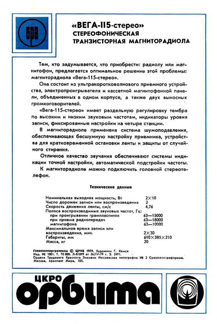 Комбинированное устройство *Вега-115-стерео* с 1978 года выпускал Бердский радиозавод. КУ предназначено для высококачественного воспроизведения моно и стерео магнитофонных и граммофонных записей, приёма моно и стерео ЧМ радиостанций. КУ включает в себя ЭПУ с электромагнитной головкой, микролифтом, автостопом, утяжеленным диском, подстройкой частоты вращения и стробоскопическим контролем, кассетную стереофоническую двухдорожечную МП, имеющую регуляторы уровня записи со стрелочными индикаторами. КУ имеет АПЧ, блок фиксированных настроек, БШН, сквозной стереотракт, выносные АС. Есть возможность подключения внешнего тюнера, магнитофона, микрофона, стереотелефонов. Чувствительность тюнера 4 мкВ. Диапазон рабочих частот - 4,56...4,11 МГц. Номинальная выходная мощность 2х10 Вт. Полоса воспроизводимых звуковых частот с ЭПУ - 31,5...16000 Гц. Питание: сеть с напряжением 110, 127, 220 или 240 В. Габариты основного блока - 610 х 420 х 210 мм, АС - 420 х 250 х 190 мм. Масса комплекта 38 кг. Цена КУ с АС - 700 рублей.
