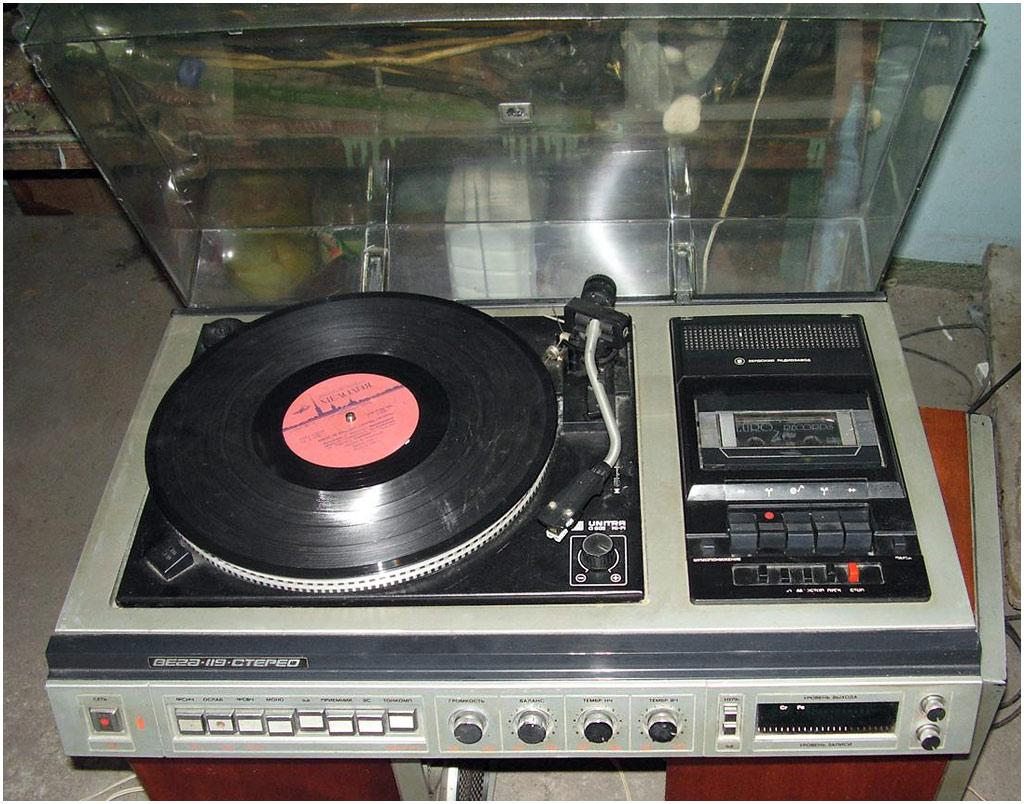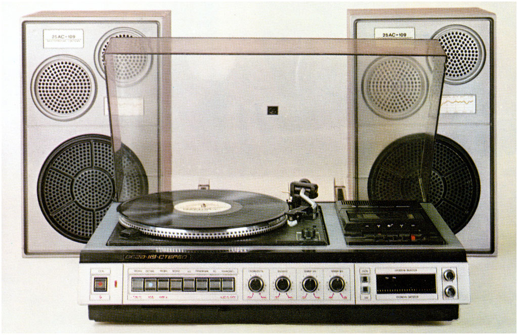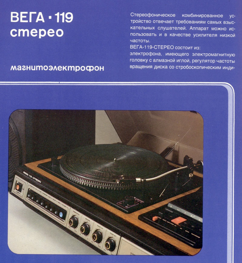 Комбинированное устройство - магнитоэлектрофон *Вега-119-стерео* с начала 1986 года выпускало Бердское ПО Вега. Магнитоэлектрофон состоит из ЭПУ G-602С, кассетной магнитофонной панели, усилителя, объединенных в одном блоке и двух акустических систем 25 АС-109. КУ имеет систему шумопонижения, поиска фонограмм по паузам, фильтры ВЧ и НЧ, отключаемую тонкомпенсацию, временный стоп ЛПМ, электронный счетчик расхода ленты, электронный индикатор для уровня записи и воспроизведения, регулятор частоты вращения диска со стробоскопом, компенсатор скатывающей силы звукоснимателя, микролифт и автостоп для проигрывателя. ЛПМ типа СМ-1 (Венгерская НР) однодвигательный, пермаллоевая головка работа с двумя типами магнитной ленты. Номинальная выходная мощность усилителей 2х10 Вт. Диапазон воспризводимых звуковых частот при работе ЭПУ не уже 31,5....18000 Гц. Диапазон воспризводимых звуковых частот при работе магнитофона 40...14000 Гц. Потребляемая от электрической сети мощность 80 Вт. Наружные габариты магнитоэлектрофона 610х210х428 мм. Габариты одной акустической системы - 285х480х253 мм. Масса магнитоэлектрофона около 20 кг. Масса одной акустической системы 12 кг.