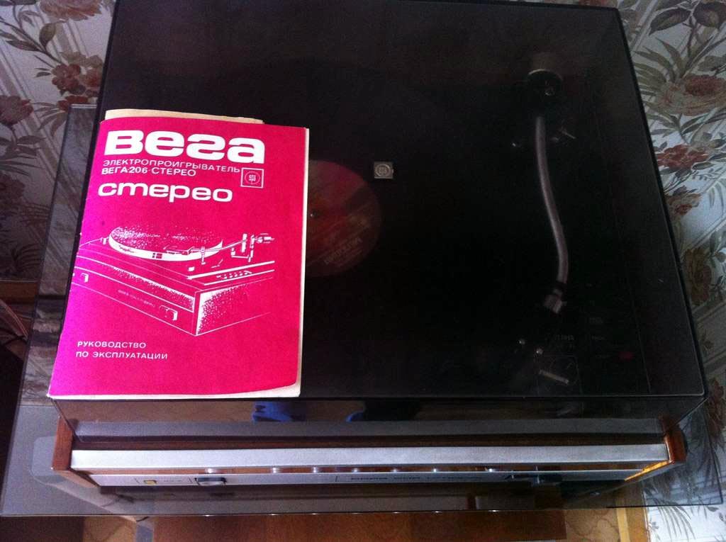 Электропроигрыватель *Вега-206-стерео* с 1975 года выпускал Бердский радиозавод. **Вега-206-стерео** - стереофонический проигрыватель 2-й группы сложности предназначенный для прослушивания моно и стереофонических пластинок совместно с электрофоном, приёмником и УКУ. Частота вращения диска 33 и 45 об/мин. Чувствительность без корректирующего усилителя 0,7, с усилителем 70 мВ. Полоса рабочих частот не уже 31,5...16000 Гц. Уровень рокота -55 дБ, фона - 57 дБ, детонации - 0,15%. Переходные затухания между каналами на частоте 315, 1000 и 10000 Гц - 15, 20 и 6 дБ. Потребляемая мощность 15 Вт. Габариты электропроигрывателя 450х380х175 мм. Вес 13 кг. Цена модели 160 рублей.