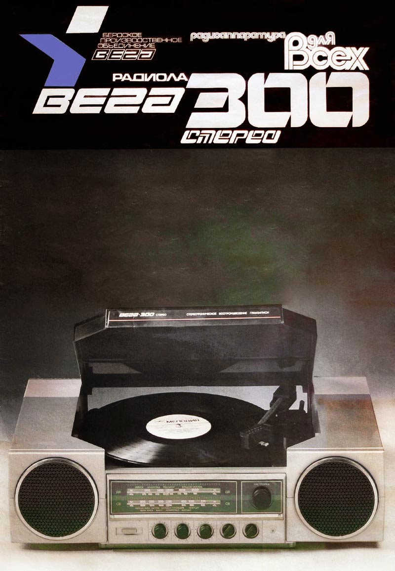 Стационарная транзисторная радиола 3-го класса *Вега-300-стерео* с 1986 года выпускалась Бердским радиозаводом. Радиола состоит из приёмного устройства, рассчитанного на приём программ радиостанций в диапазонах ДВ и СВ, электропроигрывающего устройства *II-ЭПУ-62СП*, усилителя ЗЧ и встроенных АС. В радиоле имеется электронная система для расширения стереобазы. Чувствительность приёмника в диапазонах: ДВ - 200 мкВ, СВ - 150 мкВ. Номинальная выходная мощность - 2х2 Вт. Диапазон воспроизводимых частот при приёме 125...З550 Гц, работе ЭПУ 100...10000 Гц. Потребляемая сети мощность 25 Вт. Габариты радиолы - 540х350х156 мм. Масса 9 кг.