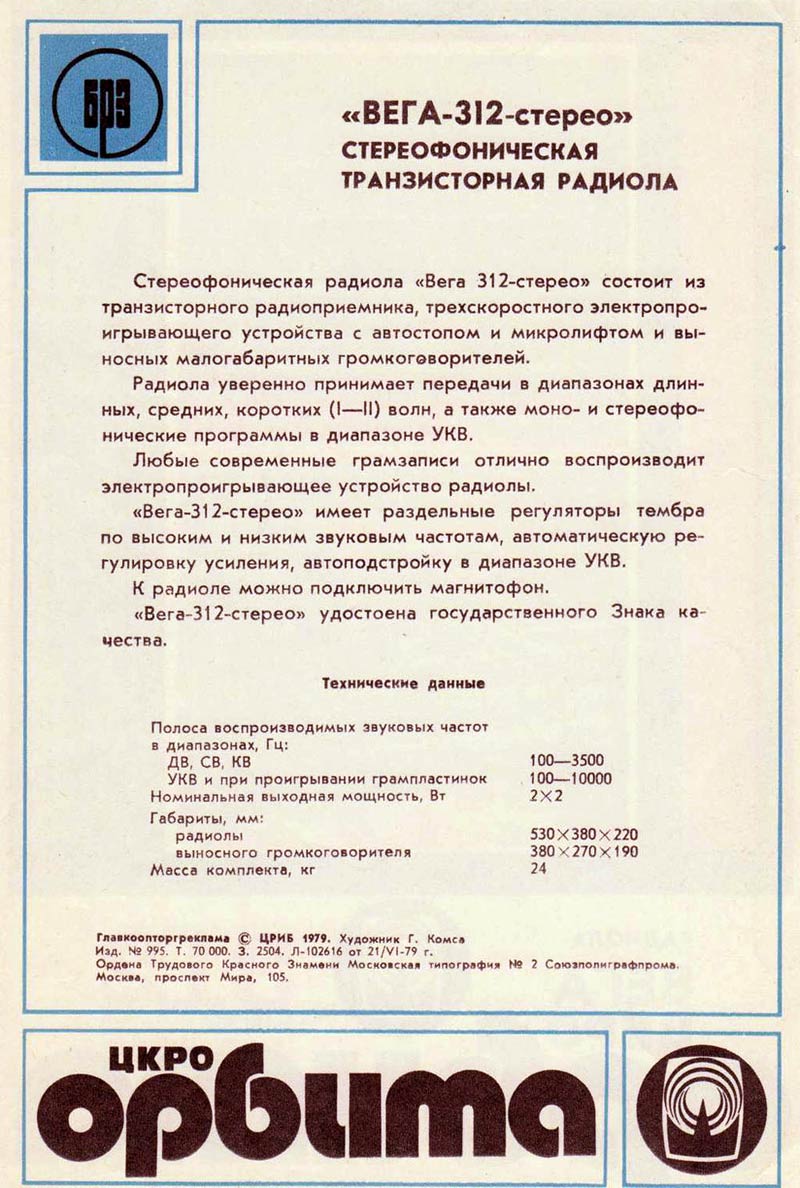Радиола *Вега-312-стерео* с 1972 года выпускалась Бердским радиозаводом. Радиола осуществляет приём в диапазонах: ДВ, СВ, КВ-1 75,9...40 м, КВ-2 32...24,8 м, УКВ-ЧМ (стерео) и воспроизведение грамзаписи с моно и стереофонических пластинок. В УКВ диапазоне имеется АПЧ. ЭПУ трёхскоростное. АС закрытого типа *ЗАС-2*, в которых размещено по громкоговорителю ЗГД-38. Максимальная выходная мощность УНЧ 2х3 Вт. Размеры радиолы 220х530х380 мм, одной АС 376х262х190 мм. Масса радиолы с АС 20 кг. Цена радиолы 150 рублей, позже (примерно с 1976 года) 193 рубля.