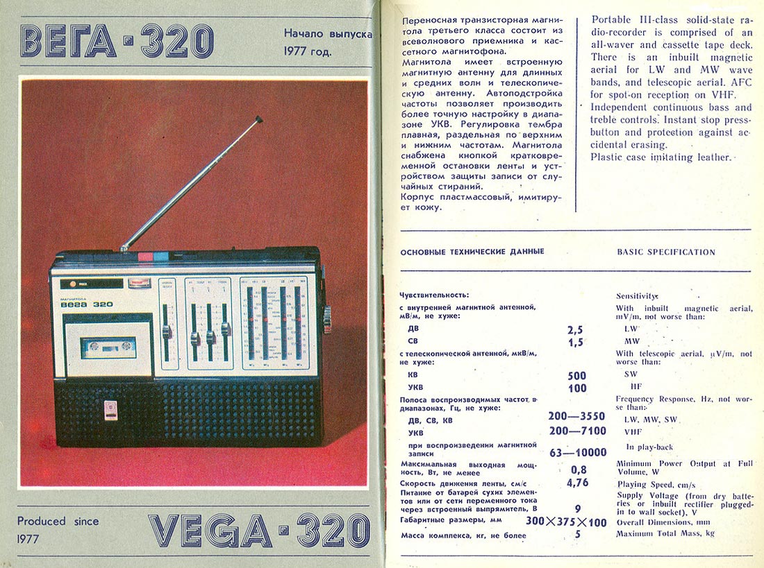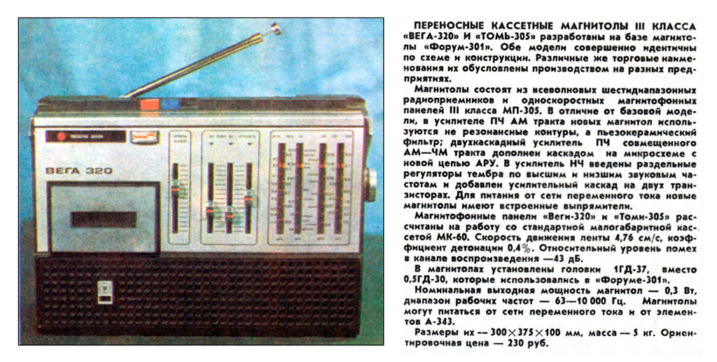 Кассетные магнитолы *Вега-320* и *Томь-305* соответственно с 1976 и 1977 года выпускали Бердский радиозавод и Томский радиотехнический завод. Магнитолы по схеме и конструкции одинаковы и разработаны на базе модели **Форум-301**. Магнитолы состоят из всеволновых шестидиапазонных приёмников и односкоростных магнитофонных панелей III класса типа МП-305 производства Томского РТЗ. В отличие от базовой модели, в усилителе ПЧ AM тракта магнитол используются не резонансные контуры, а пьезокерамический фильтр; двухкаскадный УПЧ совмёщенного AM-ЧМ тракта дополнен каскадом на микросхеме с новой цепью АРУ. В усилитель НЧ введены раздельные регуляторы тембра по ВЧ и НЧ и добавлен каскад НЧ на 2-х транзисторах. Для питания от сети магнитолы имеют встроенные выпрямители. Магнитофонные панели рассчитаны для работы со стандартной кассетой МК-60. Скорость протяжки магнитной ленты 4,76 см/с, коэффициент детонации 0,4%. Относительный уровень помех в канале воспроизведения -43 дБ. В магнитолах установлены динамические головки 1ГД-37 вместо 0,5ГД-30, которые применялись в магнитоле **Форум-301**. Номинальная выходная мощность магнитол 0,3 Вт, максимальная 0,8 Вт. Диапазон частот звука на линейном выходе 63...10000 Гц, а диапазон частот воспроизводимых встроенным громкоговорителем при работе магнитофона и приёмника в диапазоне УКВ - 200...7100 Гц. В остальных диапазонах 200...3550 Гц. Наружные габариты любой из магнитол 300х375х100 мм, вес не более 5 кг. Розничная цена 230 рублей.