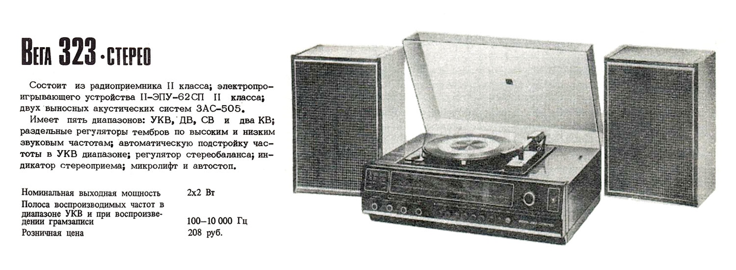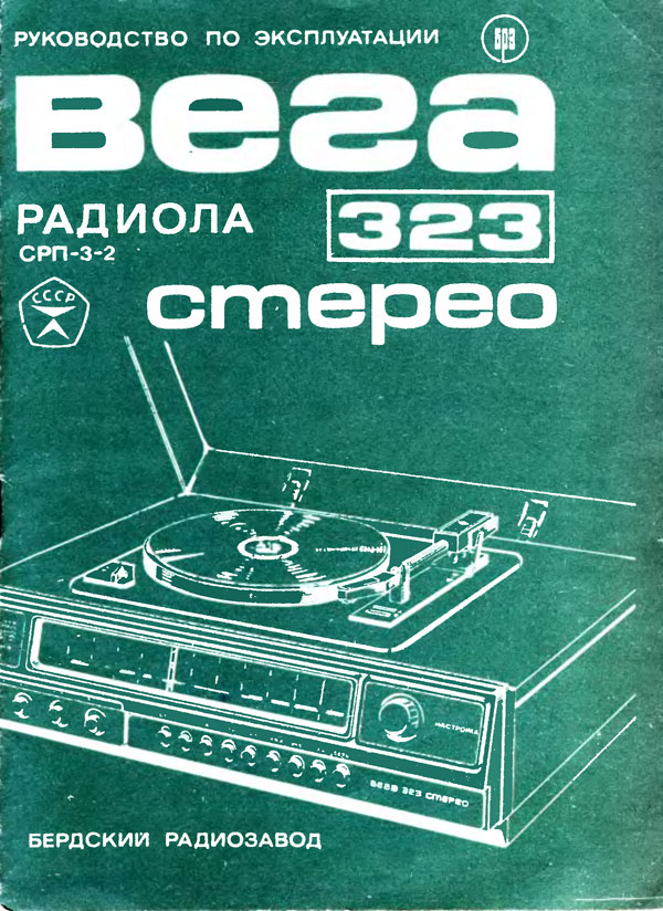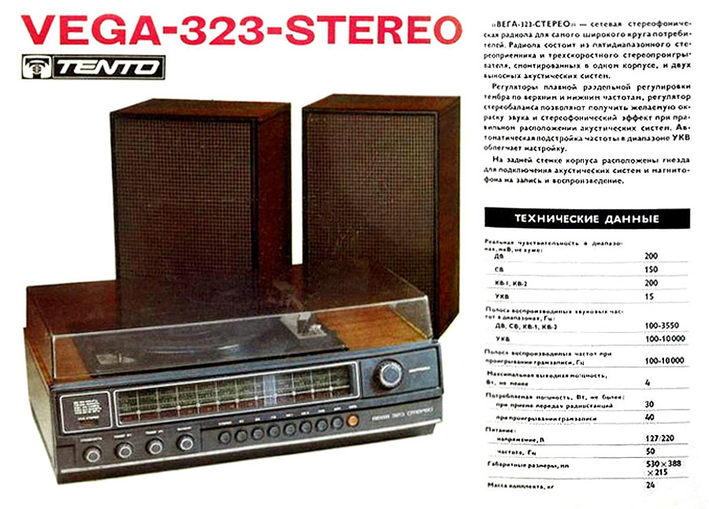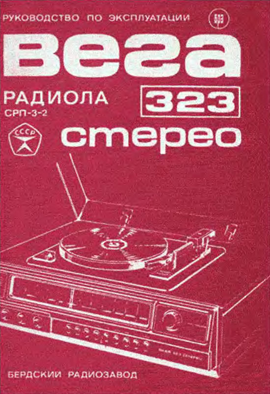 Стереофоническая радиола 3-го класса *Вега-323-стерео* с 1979 года выпускалась Бердским радиозаводом. Радиола предназначена для приёма в диапазонах: ДВ, СВ, КВ, УКВ и прослушивания грампластинок. Радиола состоит из приемника, ЭПУ и 2-х выносных АС. Тембр по ВЧ и НЧ регулируется раздельно. Подстройка частоты в УКВ диапазоне автоматическая. Радиола имеет индикатор наличия стереопередачи. Радиолу выпускали с двух и трёхгодичным гарантийным сроком и соответственно с различной розничной ценой. Полоса воспроизводимых звуковых частот в диапазонах ДВ, СВ, KB - 100...3550 Гц, на УКВ или при воспроизведении грамзаписи - 100...10000 Гц. Максимальная выходная мощность - 2х2 Вт. Потребляемая мощность 30/40 Вт. Габариты радиолы 220х540х382 мм. Масса 24 кг.