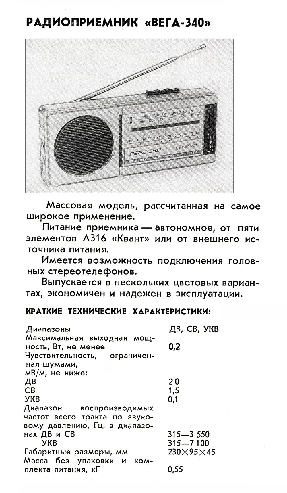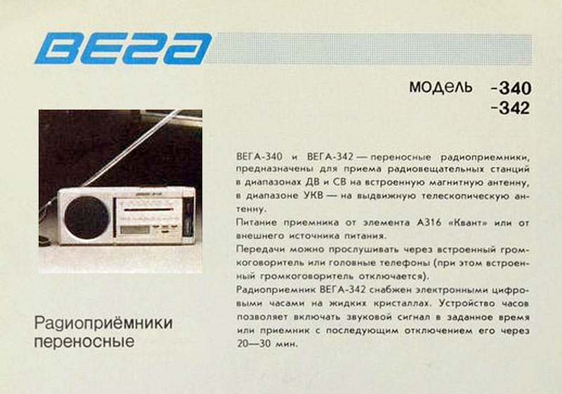 Портативные радиоприёмники "Вега-340", "Вега-342" выпускал Бердский радиозавод с 1986 года. Радиоприёмники *Вега-340* и *Вега-342* принимают программы радиовещательных станций в диапазонах ДВ и СВ на встроенную магнитную антенну, а в диапазоне УКВ-ЧМ на встроенную телескопическую. Передачи можно слушать и на головные телефоны, при этом громкоговоритель отключается. В отличие от приёмника **Вега-340**, приёмник **Вега-342** имеет электронные цифровые часы. Помимо отображения текущего времени они в заранее заданное время могут включить и выключить приёмник или сигнальное устройство - будильник. Питание приёмников осуществляется от 5 элементов 316. Основные характеристики: Реальная чувствительность в диапазонах: ДВ - 2, СВ - 1,6, УКВ - 0,1 мВ/м. Селективность в АМ - 28 дБ. Диапазон воспроизводимых звуковых частот в ДВ и СВ диапазонах - 315...3550 Гц, в УКВ диапазоне - 315...7100 Гц. Номинальная выходная мощность - 0,2 Вт. Габариты РП - 230х95х45,5 мм, Масса 700 гр. На базе модели "Вега-342" другой завод выпускал приёмник - "Электроника-304".