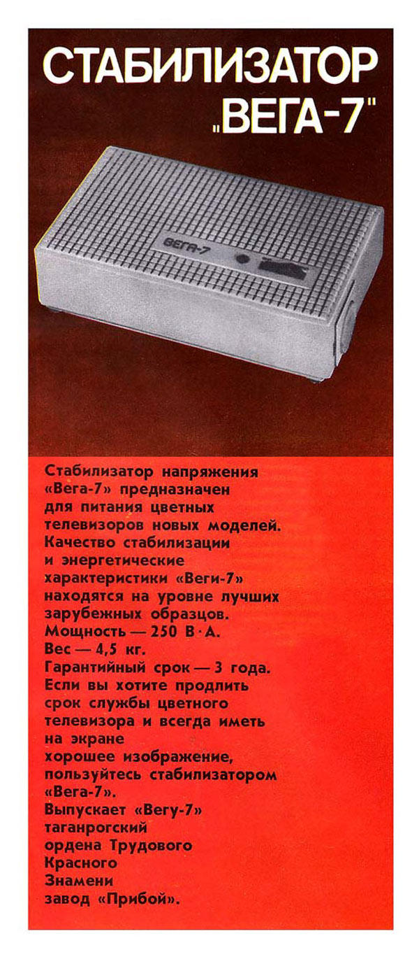 Стабилизатор напряжения *Вега-7* предположительно с 1984 года выпускал Таганрогский завод *Прибой*. Стабилизатор предназначен для питания стабилизированным напряжением 220 вольт телевизоров с потребляемой мощностью не более 250 Вт. Подробнее о стабилизаторе в инструкции.