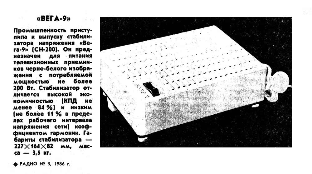 Стабилизатор напряжения *Вега-9* с 1986 года выпускал Таганрогский завод *Прибой* и другие заводы. Стабилизатор напряжения **Вега-9** (СН-200) предназначен для питания стабилизированным напряжением телевизоров с потребляемой мощностью не выше 200 Вт. Стабилизатор автоматически поддерживает необходимое напряжение для телевизора в условиях, когда напряжение сети понижается или повышается относительно номинального. Стабилизатор обеспечивает нормальную работу телевизору и увеличение срока службы кинескопа и радиоламп. Допустимая выходная мощность стабилизатора: минимальная 100, максимальная 200 Вт. Допустимые колебания входного напряжения 154...253 В. Стабилизированное напряжение выхода 198...231 В. КПД стабилизатора 84%. Вес стабилизатора 3,4 кг.