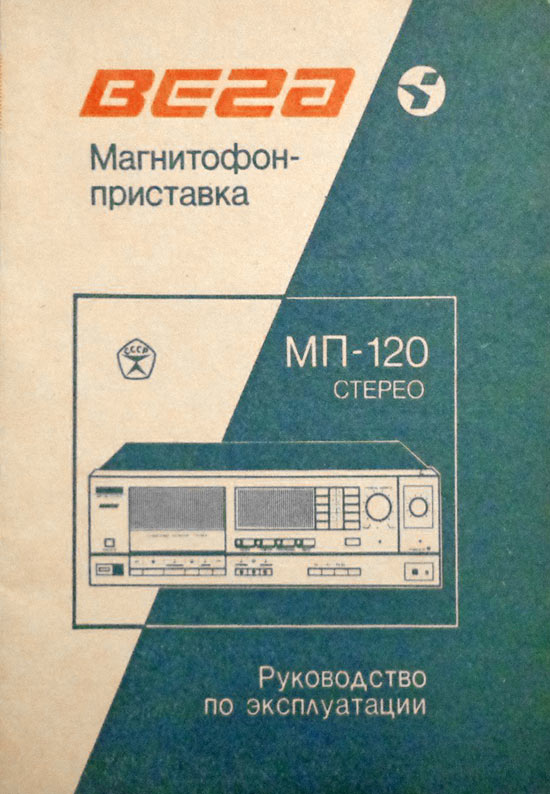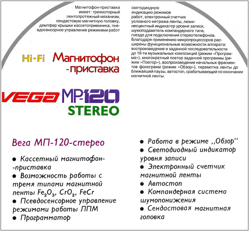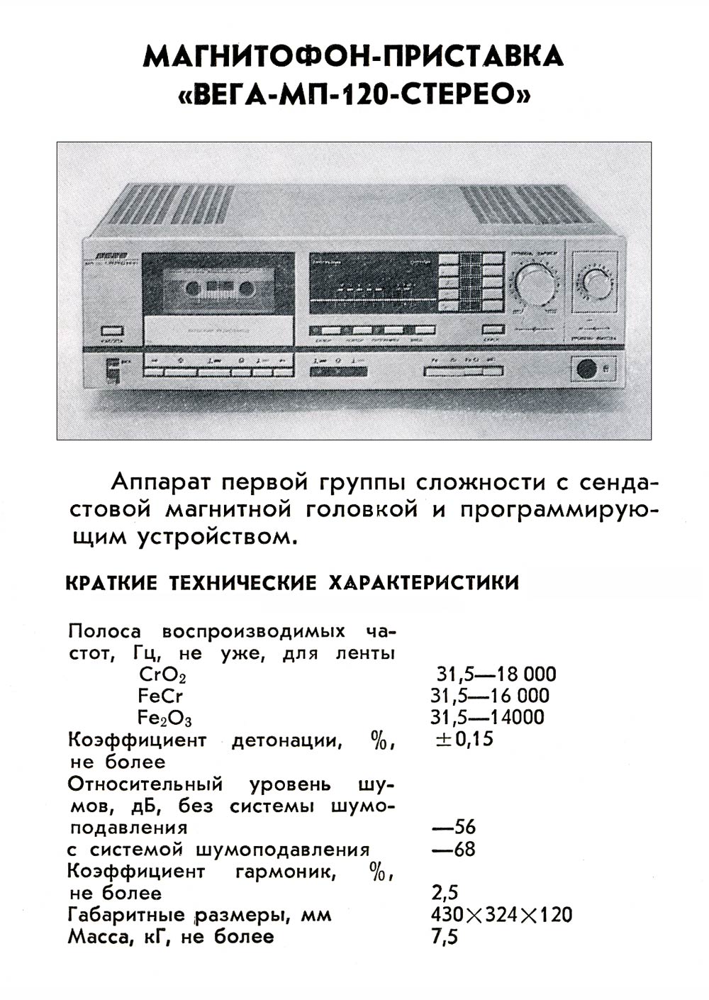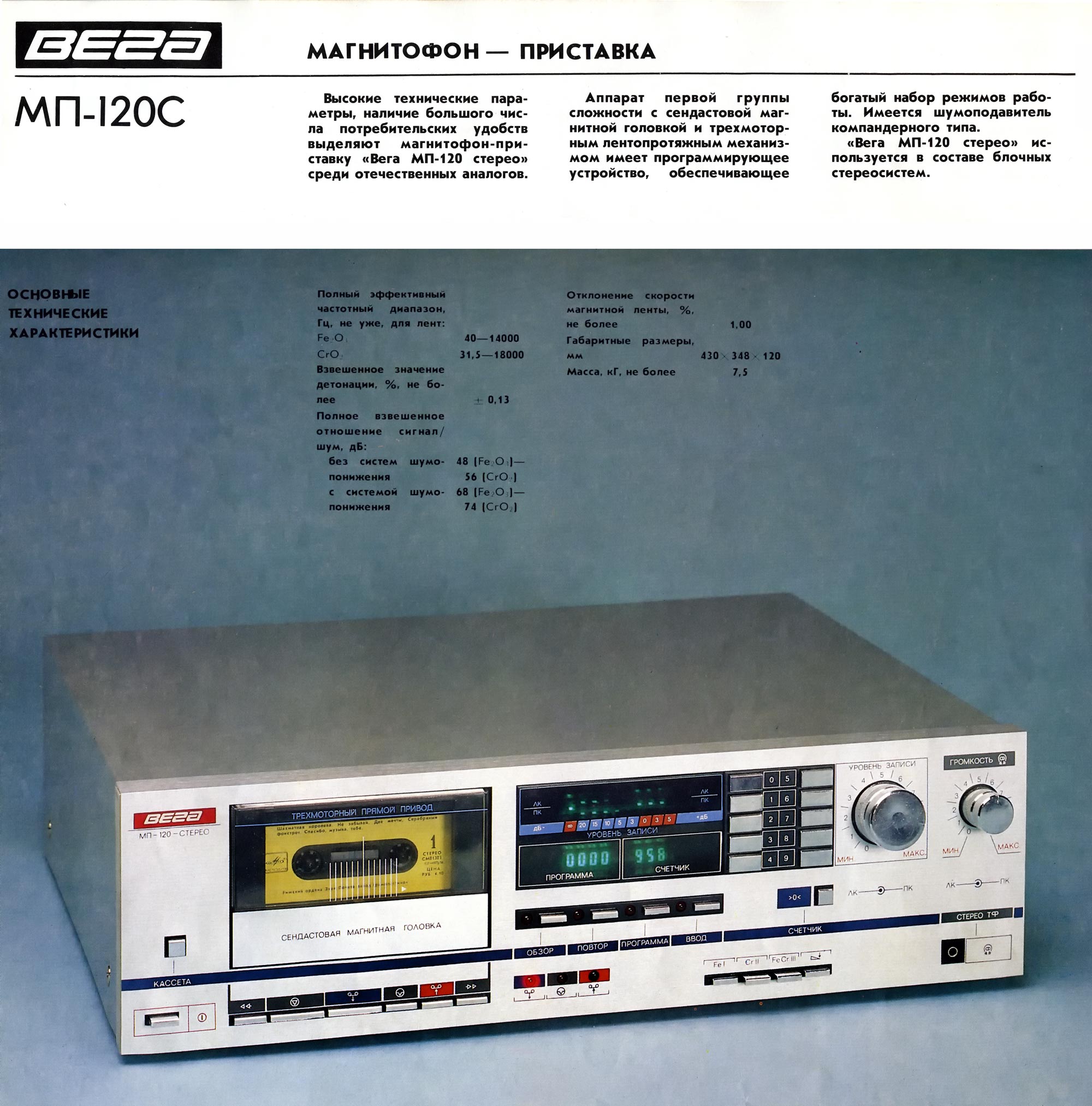 Магнитофон-приставка *Вега МП-120-стерео* с 1987 года выпускало Бердское ПО *Вега*. Предназначена для записи фонограмм на магнитную ленту и их воспроизведения через стереофонические головные телефоны и внешнее УКУ. В модели применены: псевдосенсорное управление режимами работ, автостоп, электронный счетчик расхода ленты, компандерный шумоподавитель, программатор для воспроизведения заранее выбранных фрагментов, с индикацией их номера, есть режим *Обзор*. В аппарате применена сендастовая магнитная головка. Коэффициент детонации 0,15%. Диапазон звуковых частот на ленте Fe - 40..14000, Cr - 31,5..16000 Гц. Уровень шумов и помех в канале записи и воспроизведения -56 дБ. Габариты МП 430х320х120 мм, вес 7,5 кг.
