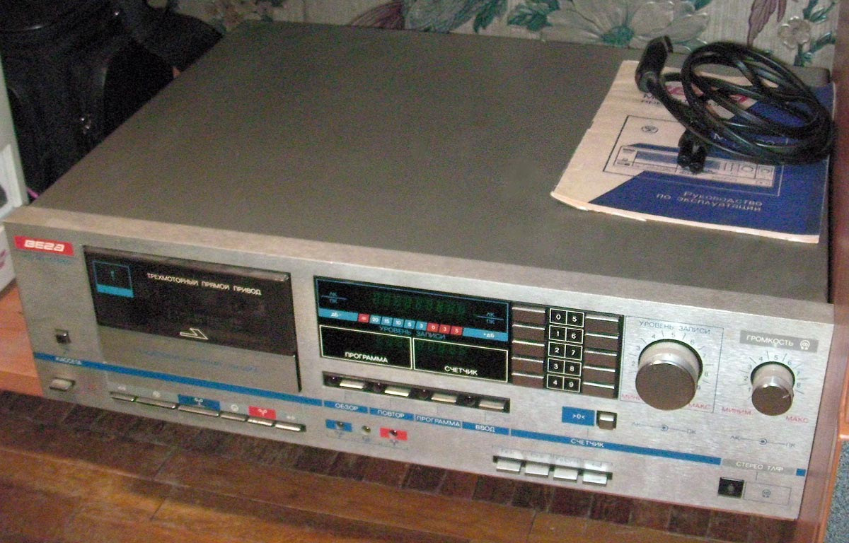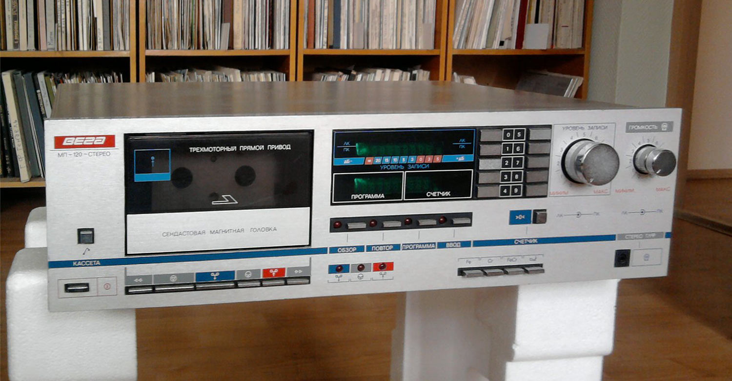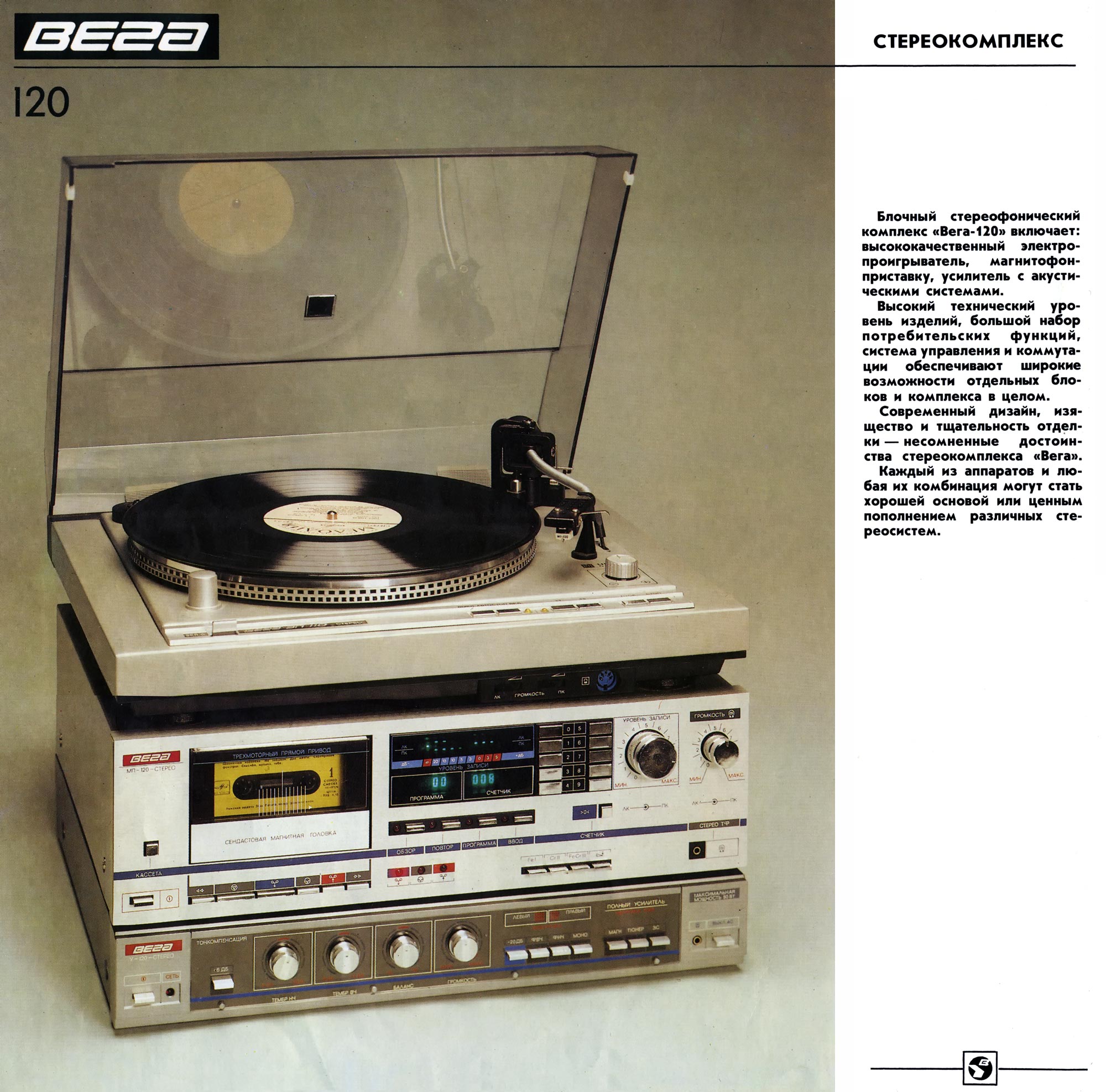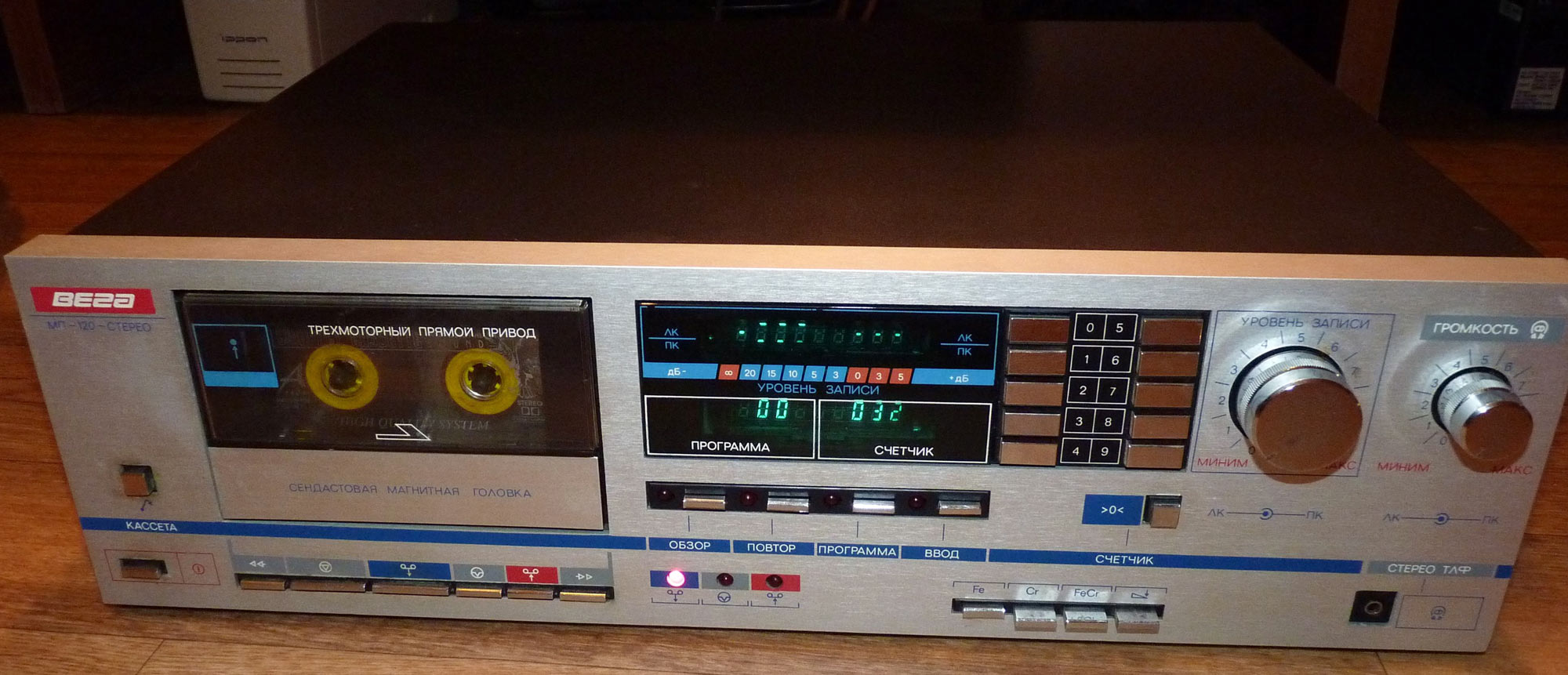 Магнитофон-приставка *Вега МП-120-стерео* с 1987 года выпускало Бердское ПО *Вега*. Предназначена для записи фонограмм на магнитную ленту и их воспроизведения через стереофонические головные телефоны и внешнее УКУ. В модели применены: псевдосенсорное управление режимами работ, автостоп, электронный счетчик расхода ленты, компандерный шумоподавитель, программатор для воспроизведения заранее выбранных фрагментов, с индикацией их номера, есть режим *Обзор*. В аппарате применена сендастовая магнитная головка. Коэффициент детонации 0,15%. Диапазон звуковых частот на ленте Fe - 40..14000, Cr - 31,5..16000 Гц. Уровень шумов и помех в канале записи и воспроизведения -56 дБ. Габариты МП 430х320х120 мм, вес 7,5 кг.