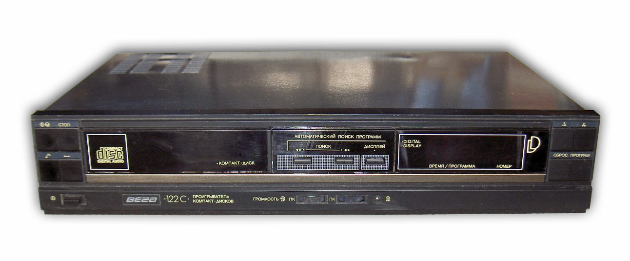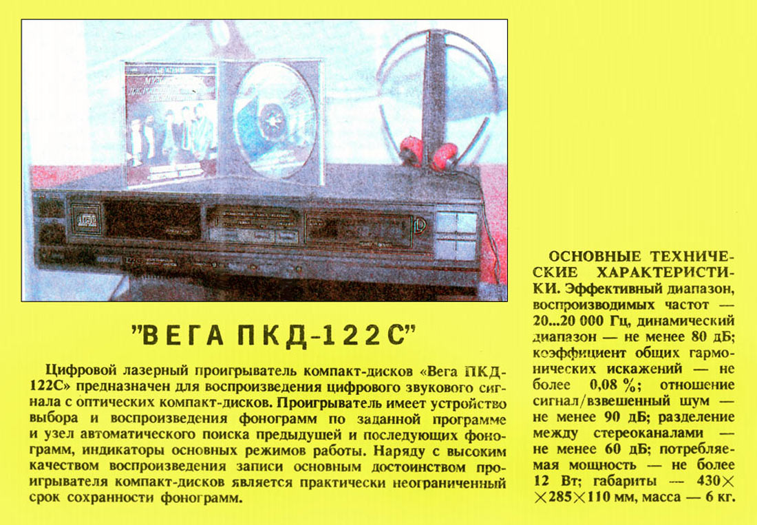 Проигрыватель компакт-дисков "Вега ПКД-122С" с 1991 года выпускал Бердский радиозавод. ПКД предназначен для воспроизведения цифрового сигнала с лазерных компакт дисков и преобразования его в сигнал звуковой частоты. ПКД имеет: устройство для выбора и воспроизведения фонограмм по заданной программе; узел автоматического поиска предыдущей и последующих фонограмм; индикаторы режимов работы. Диапазон рабочих частот 20...20000 Гц, КНИ - 0,08%. Отношение сигнал/взвешенный шум 90 дБ. Разделение между стереоканалами 60 дБ. Потребляемая мощность 12 Вт. Габариты ПКД - 430х285х110 мм. Масса 6,1 кг. ПКД входил в комплекс "Вега-122С", но продавался и отдельно.