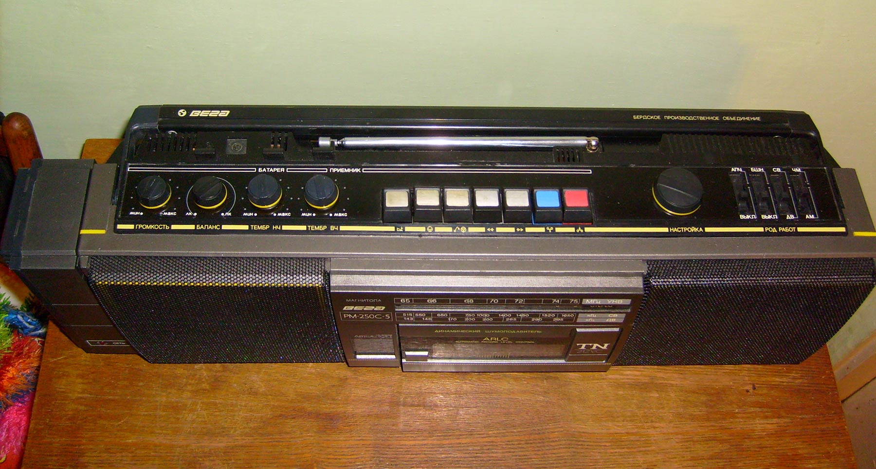 Переносная стереофоническая магнитола *Вега РМ-250С-5* с 1995 года выпускало Бердское ПО *Вега*. Предназначена для приёма в диапазонах ДВ, СВ, УКВ (стерео), магнитной записи и воспроизведения звука на ленте МЭК-I. Магнитола имеет: неотключаемую АПЧ в диапазоне УКВ; АРУЗ; автоматическую остановку ЛПМ по окончании ленты; динамический шумоподавитель при воспроизведении. Модель производит моно и стереофоническую записи со своего приёмника и внеших источников. Питание от 6 элементов 373 и от сети с помощью выносного БП. Диапазон частот по звуковому давлению в диапазонах ДВ, СВ 160...4000 Гц; УКВ 160...10000 Гц. Частотный диапазон на ЛВ магнитофонной панели 40...12500 Гц. Максимальная выходная мощность 2х4 Вт; музыкальная 2х8 Вт. Габариты магнитолы 466x153x110 мм. БП 46x140x75 мм. Масса без БП и батарей 3,1 кг. Масса блока питания 0,75 кг.