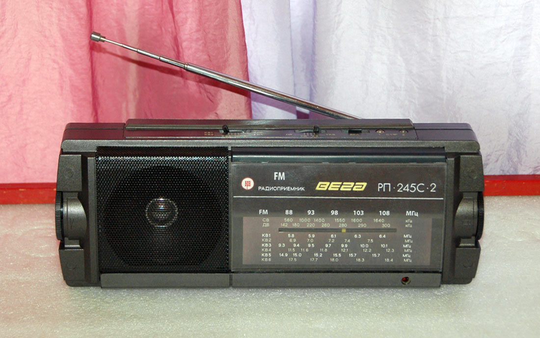 Портативный радиоприёмник *Вега РП-245С-2* выпускался с 1997 года Бердским радиозаводом. Радиоприёмник рассчитан на приём в диапазонах: ДВ, СВ, КВ-1 (5,8-6,4 МГц), КВ-2 (6,9...7,5 МГц), КВ-3 (9,3...10,1 МГц), КВ-4 (11,5...12,3 МГц), КВ-5 (14,9...15,7 МГц), КВ-6 (17,5...18,4 МГц и УКВ 88...108 МГц. В ДВ, СВ приём ведётся на магнитную антенну, в KB и УКВ - на телескопическую. Возможен приём стереопередач в УКВ диапазоне и прослушивание их на стереотелефоны. В радиоприёмнике имеется светодиодный индикатор стереосигнала, гнездо подключения внешнего питания. Диапазон воспроизводимых частот в АМ диапазонах 315...3150, УКВ 315...8000 Гц. Максимальная выходная мощность 0,8 Вт. Габариты модели 320х120х95 мм. Вес без батарей 1,5 кг.